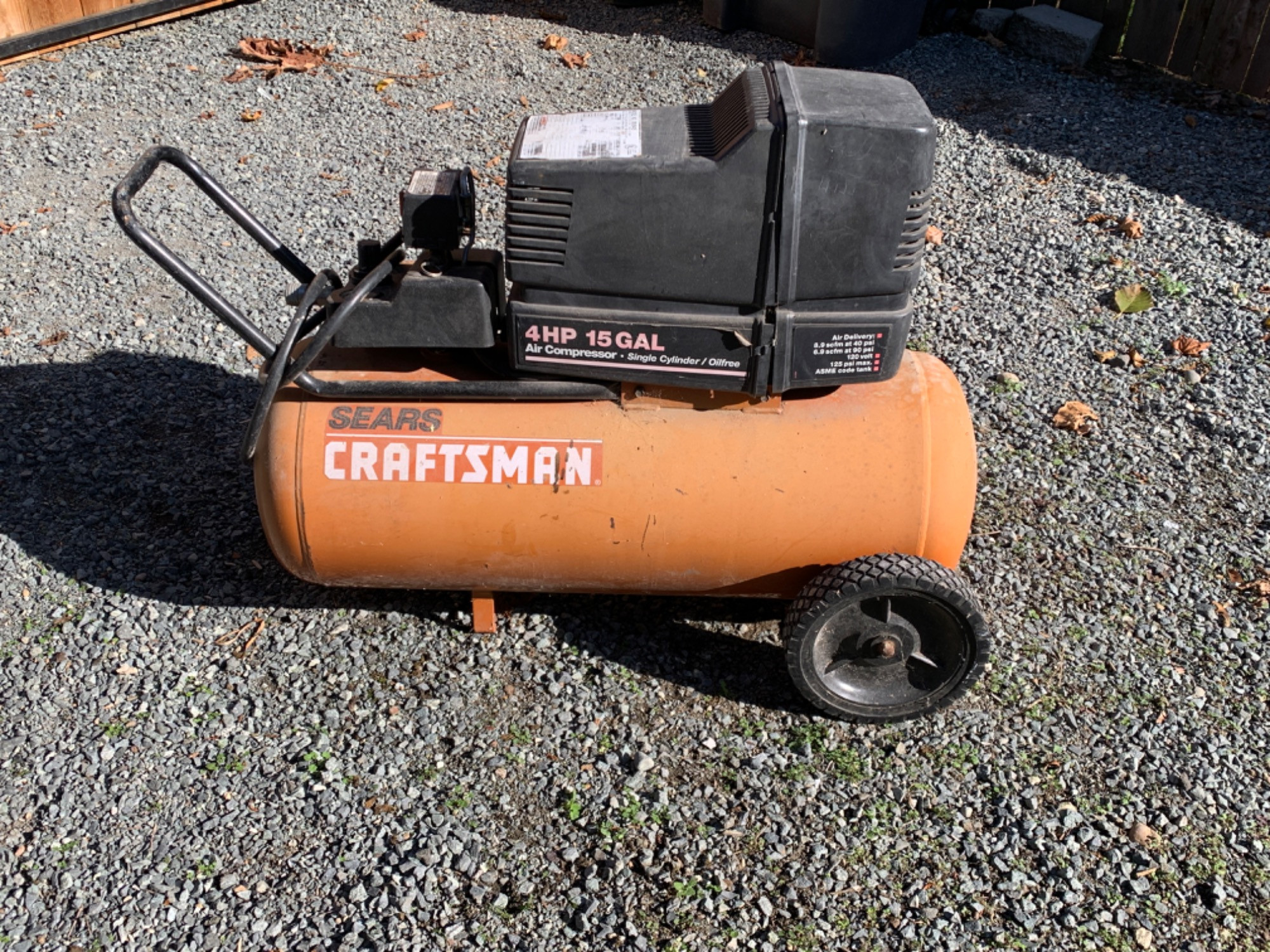 Model # 919.16415 4HP, 15 gallons, 120Volt wired Electric air compressor. Powered up. Heavy and awkward. Bring help to load.