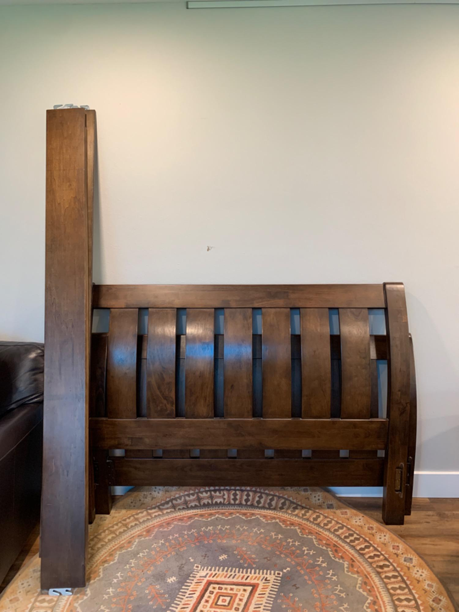 All wood queen bed. Ready for pick-up includes 5 sturdy support beams, bolts Head and foot boards curve slightly. In great condition.