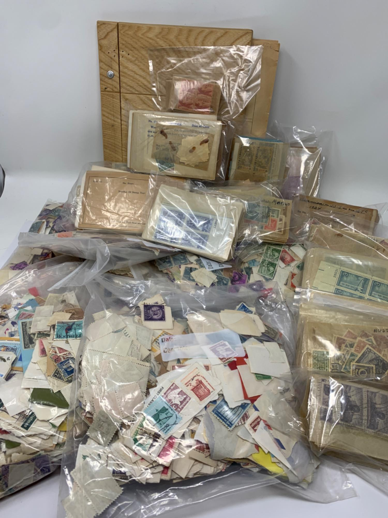 Philatelies dream lot Sheets of philatelic maps. THOUSANDS of stamps. Global and National stamps. Some new and some used. Many are stored in wax paper envelopes and sheets. Too many to showcase all.