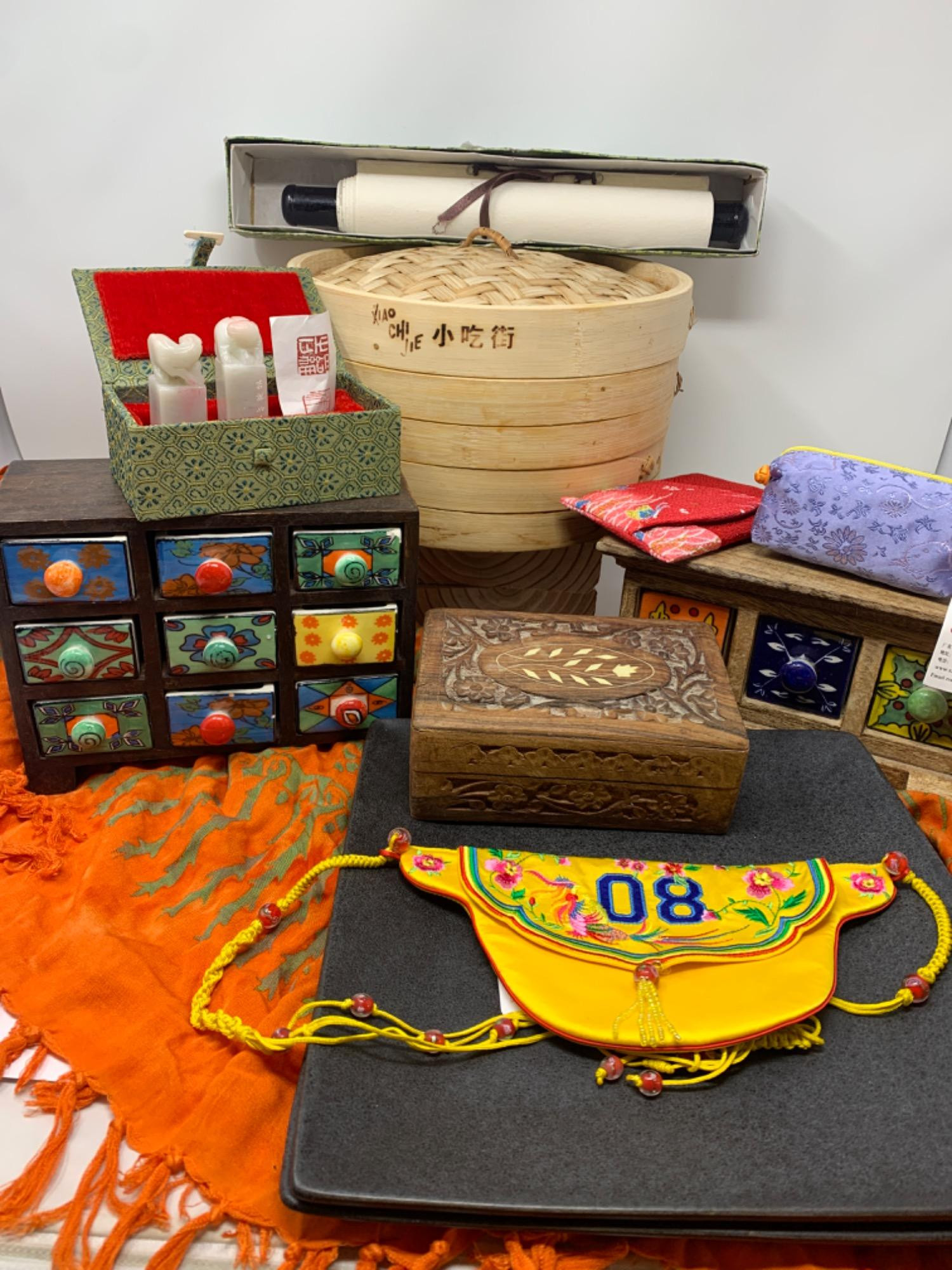 Mixed lot of decor. Cotton orange scarf with green detail. Small wood box with buttons Two spice boxes with ceramic drawers. Two heavy square plates. Asian steamer basket, wall art, fabric pouches and marble stamps