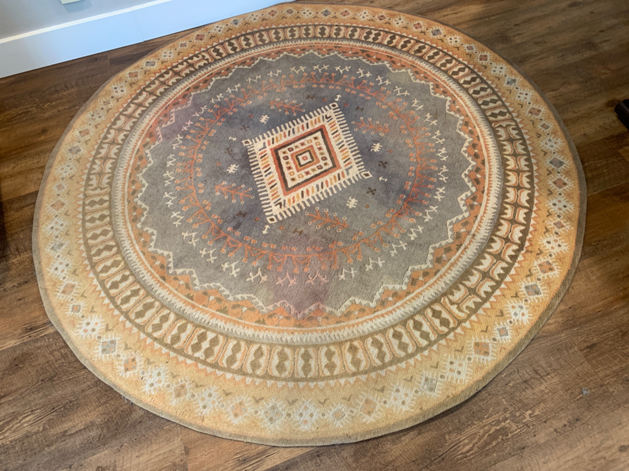 Safavieh round rug. 6x6 diameter Needs cleaned for refresh. Grey, orange, cream, black colors. 90% Cotton
