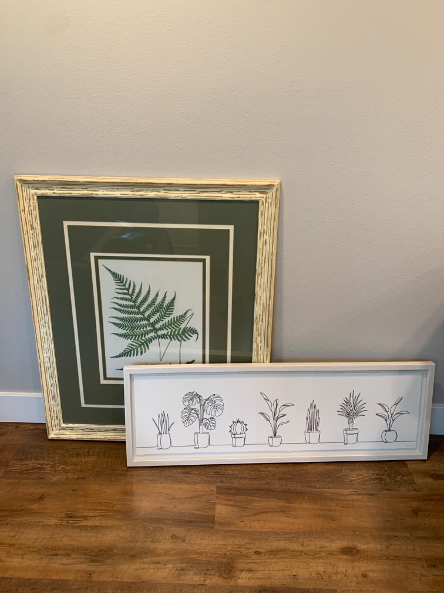 Abstract wall art dimensions are 45 inches long, 15 inches tall. Artist is Marmont Large wood framed art with fern leaf art.