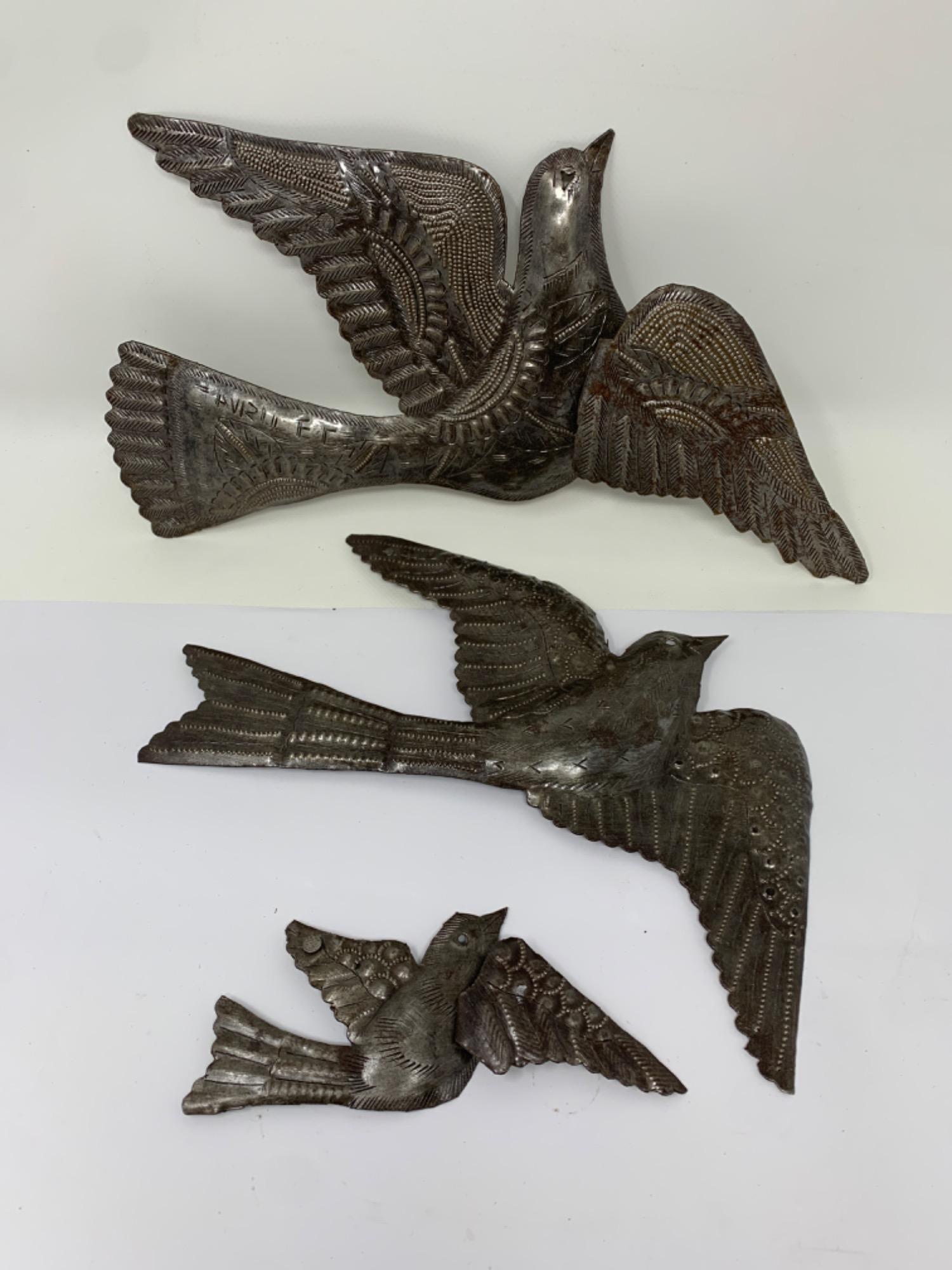 Fair trade, upcycled decor Three steel drum birds with punched nail detail Lightweight and festive
