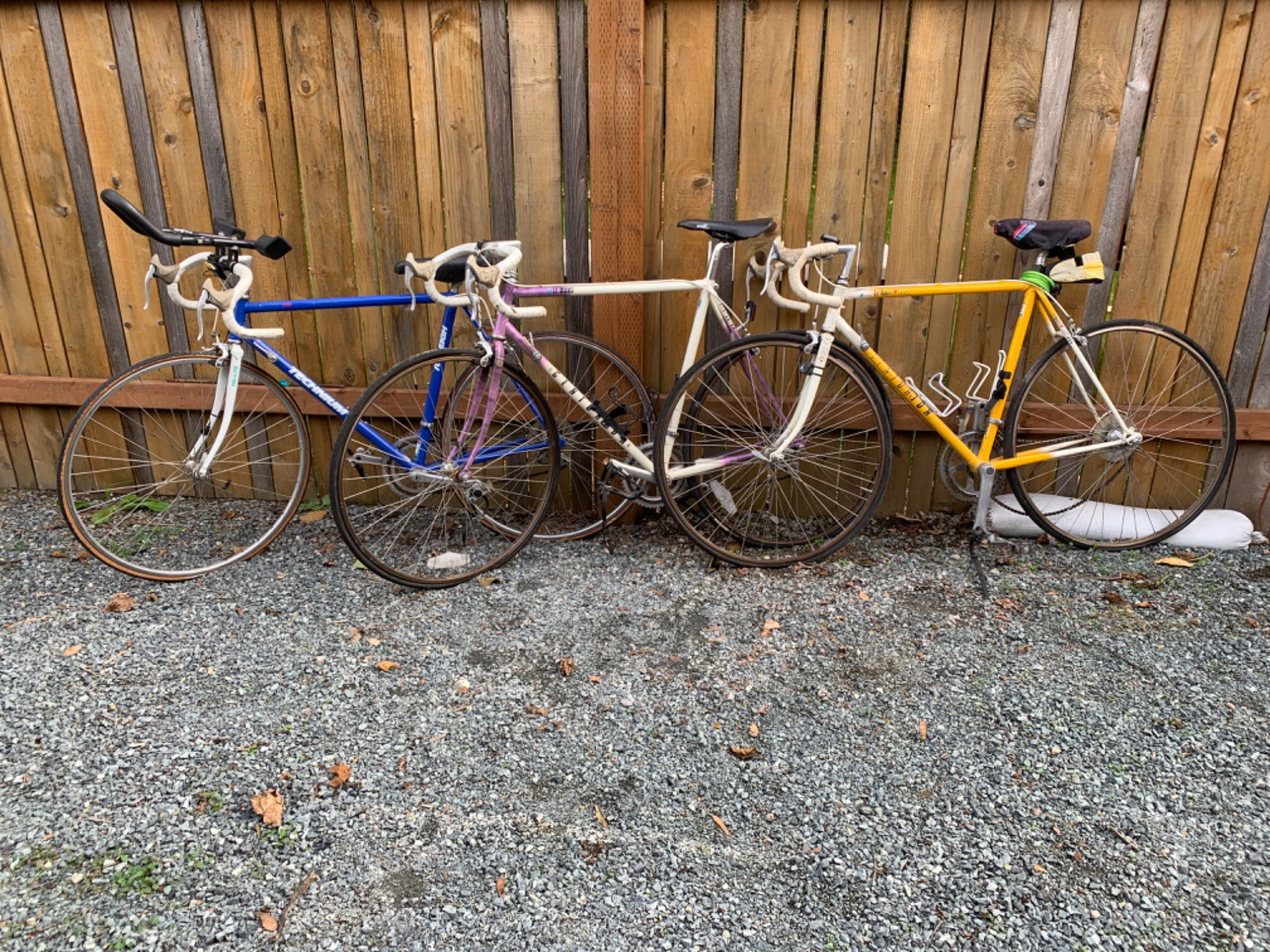 Three vintage racing bikes. Two are Le Mans and Blue is a Raleigh. All will need serviced and some maintenance for optimum performance. One includes racing bars attached. A few flat tires.