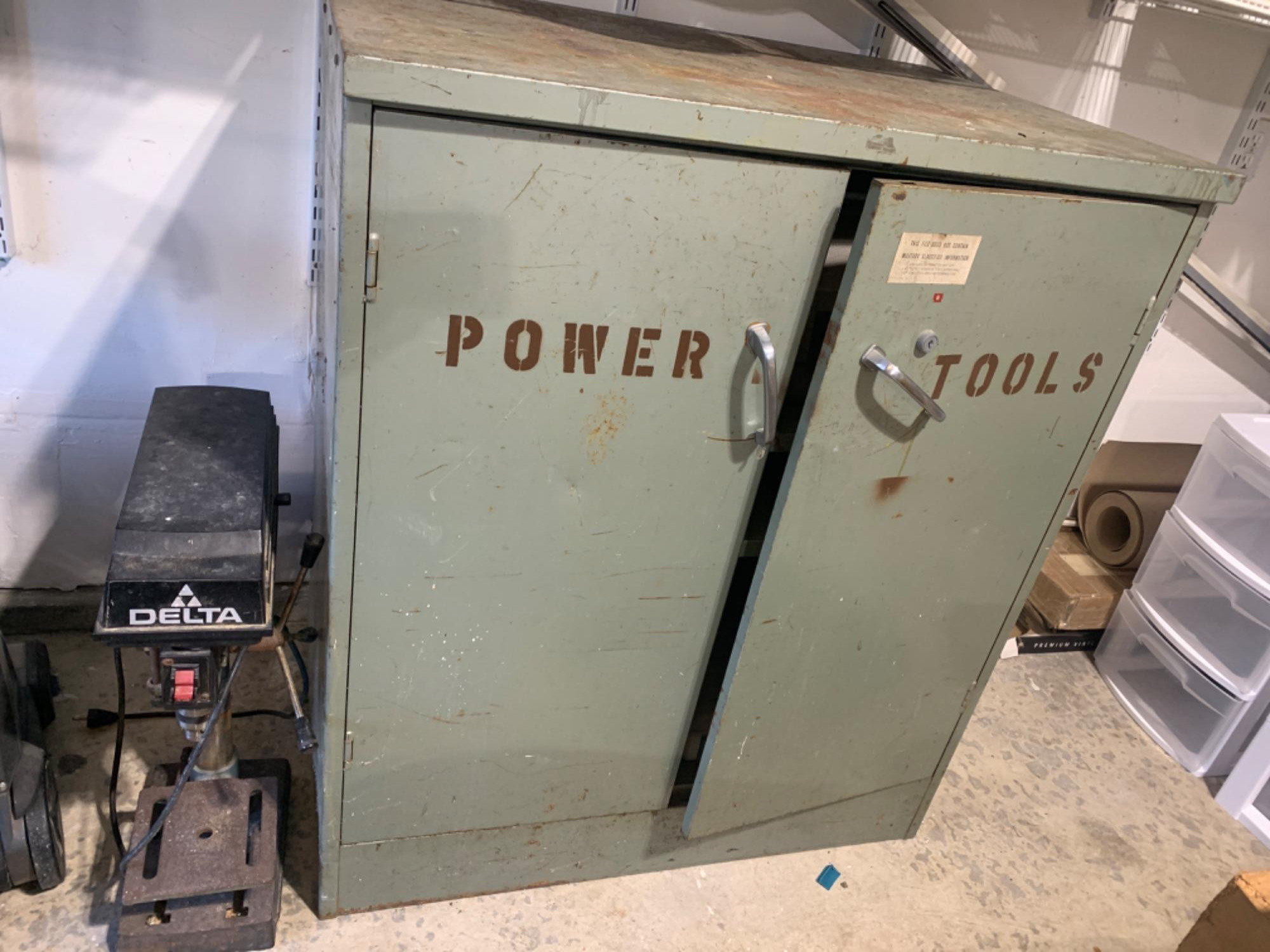 Metal storage locker with power tools. Tools powered up. 1/4in Delta drill press is 115volts. Porter Cable 7 1/4in circular saw, Pneumatic Brad Nailer. Chicago Electric palm sander. Assorted gadgets-air hose, vice, drill bits, bolt cutters and more