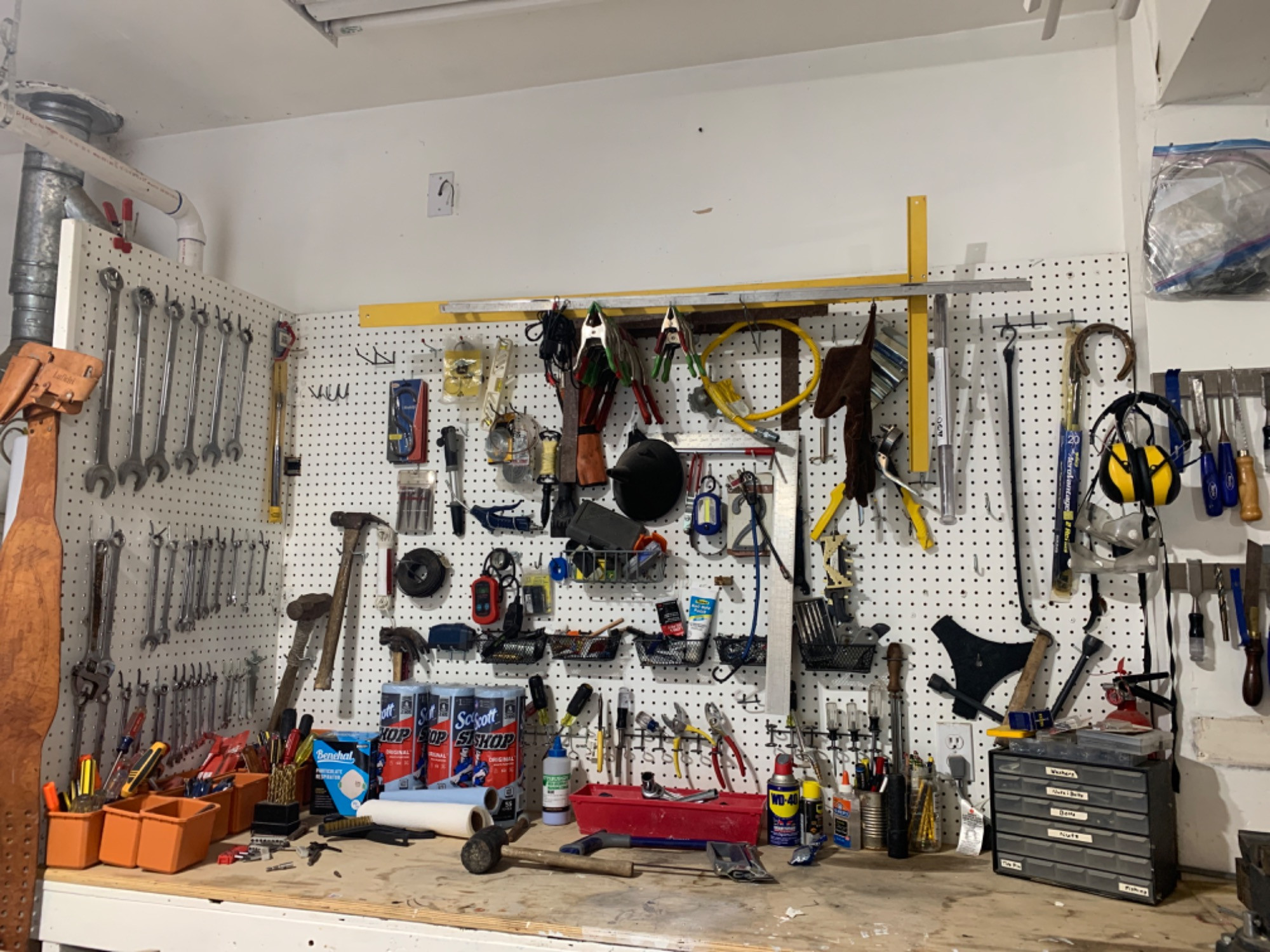 Collection includes items on pegboard walls and countertop. Does not include bench vice. Wrenches, chisels, pliers, Hazmat, hammers and more. See pics for details.