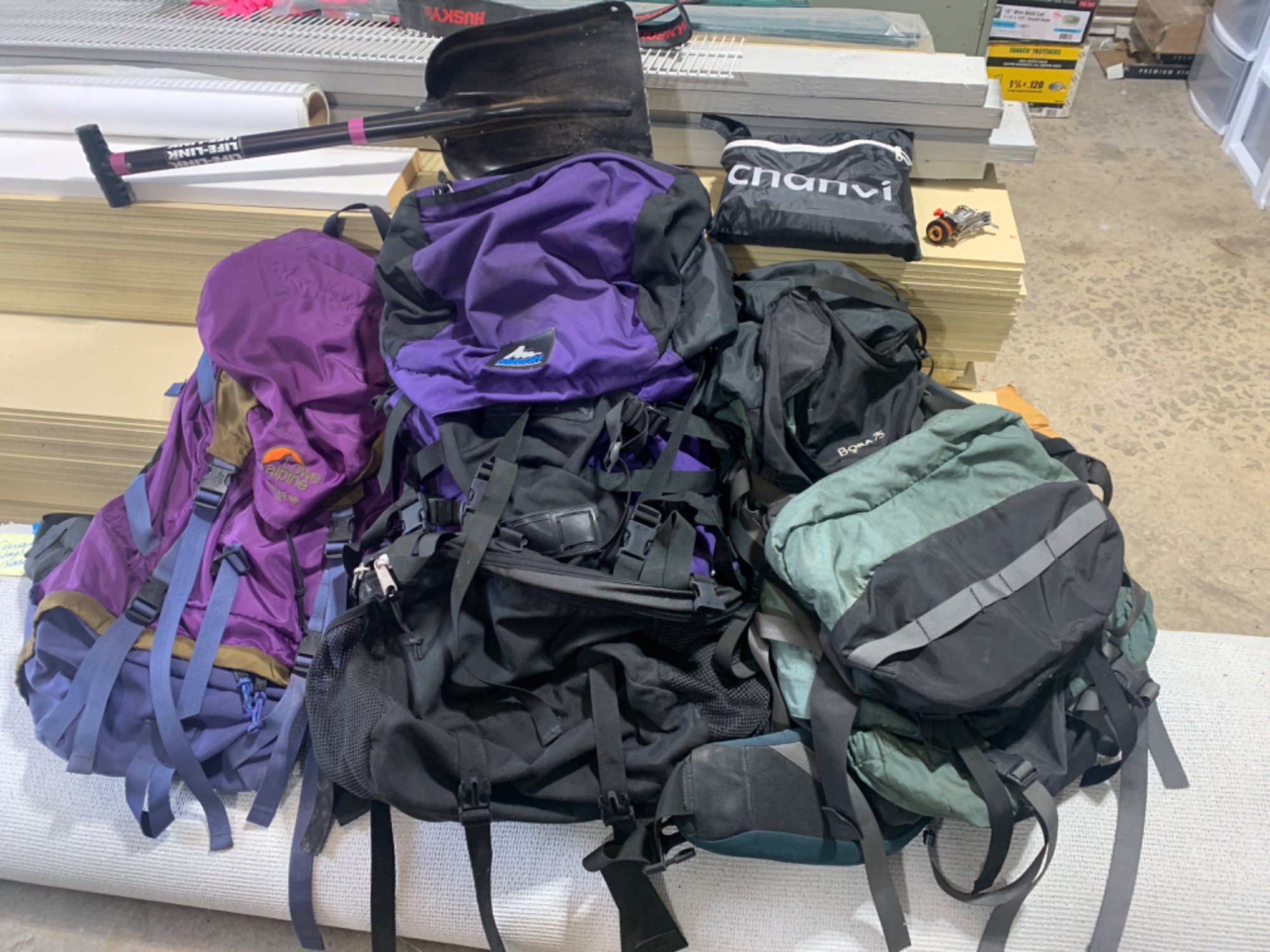 Three multiday backpacks with back support and cushion. Arctyrex Bora 75-Womens size small Gregory-Men's size large Low Alpine Outback ND 60- Womens size medium. Arctyrex includes extra bag attachment. LifeLink plastic shovel, Chanvy solar blanket, compact Etek city camp stove. In great condition, ready for new journeys.