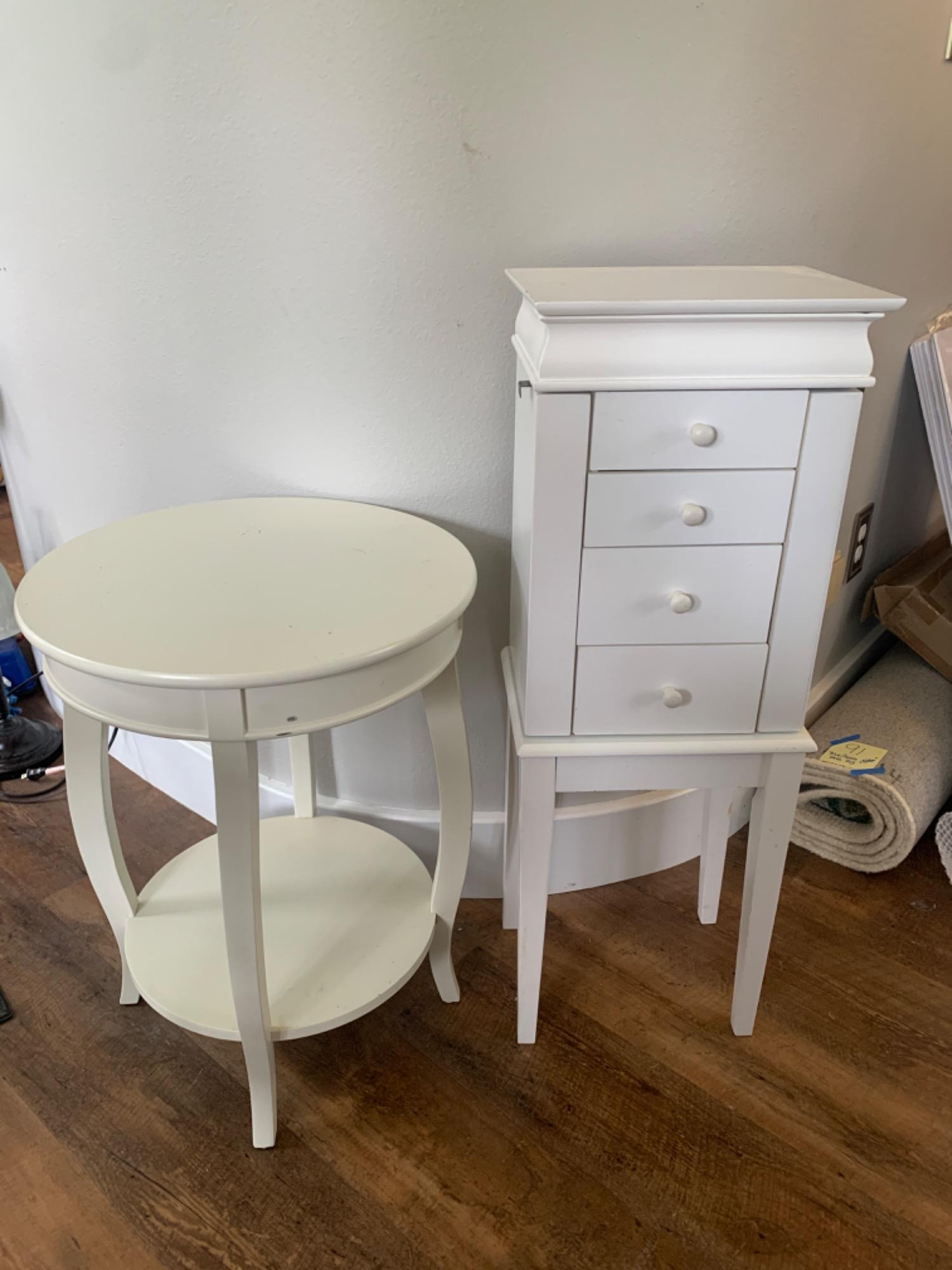 White painted wood jewelry chest with loads of storage for its size. Pink cloth lined interior. Table dimensions are 18in wide, 24in tall. Top of chest with flip top lid includes mirror and ring storage.