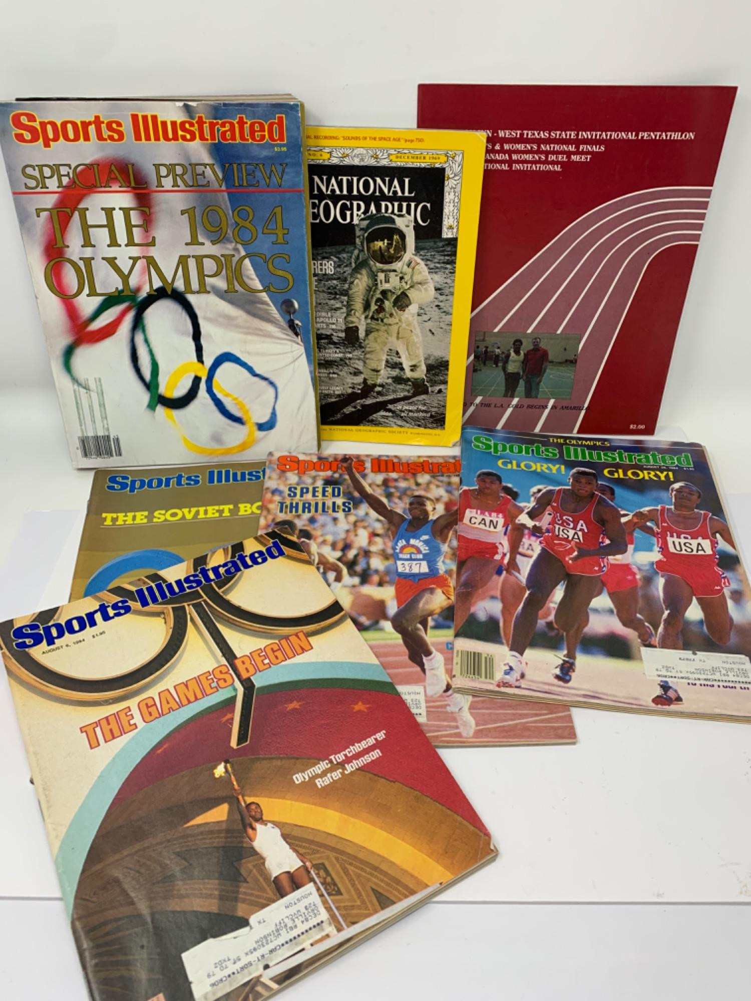 Five vintage Sports Illustrated 1984 Olympics edition magazines. Includes the boycott by Russia Carl Lewis focused cover stories. Olympics special preview guidebook is large. National Geographic Moon landing edition. December 1969. West TX State Invitational Pentathlon pamphlet.