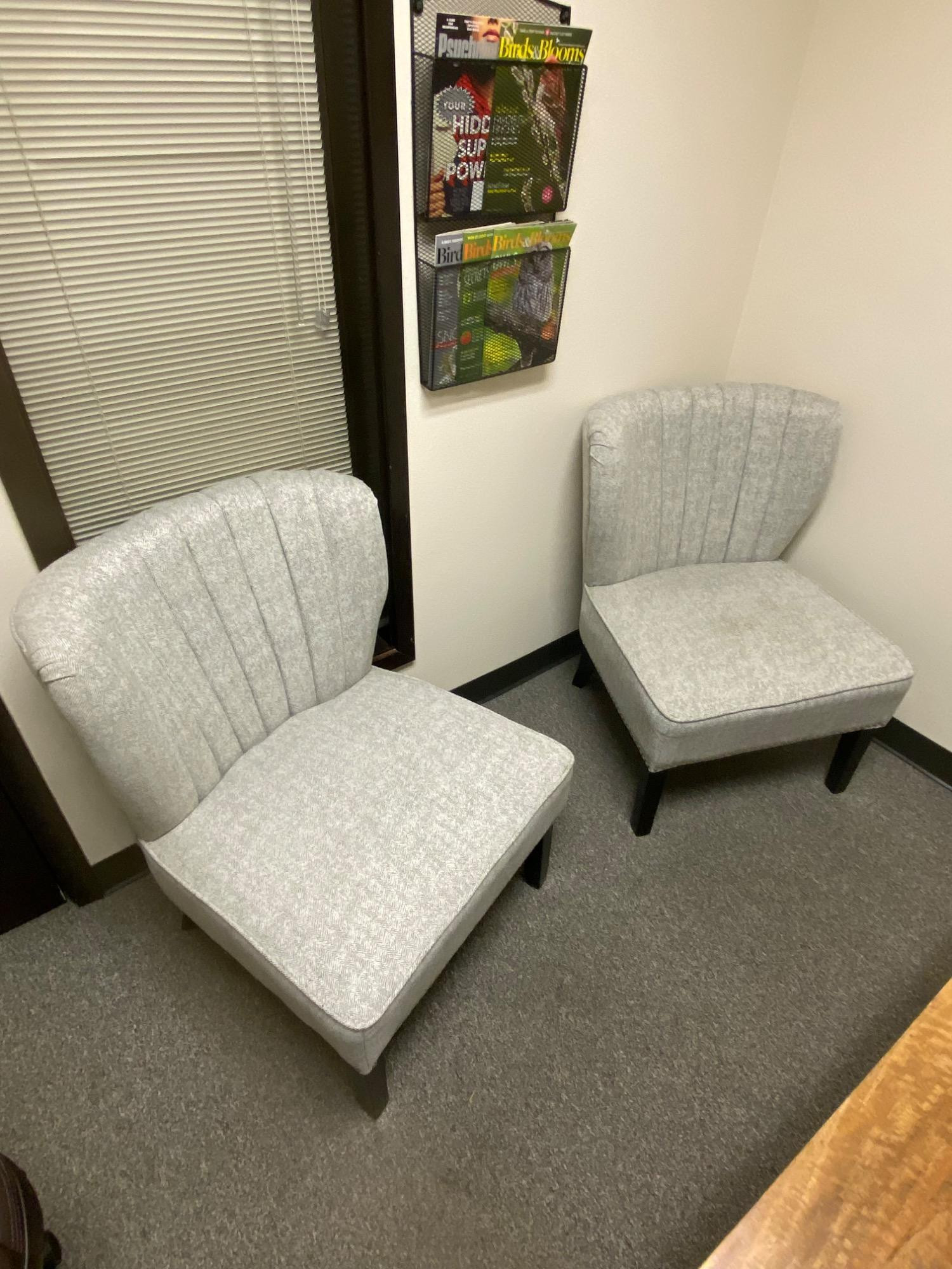 Matching set of side chairs. Upholstered in a soft gray fabric. Dimensions are approximate. In god condition.