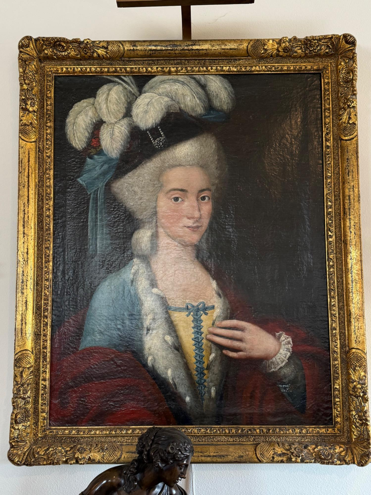 Painting, portrait of woman in blue dress with ermine trim, wearing black tricorn hat with fancy buckle and white plumes, rich red shawl draped over arms. In the style of 18th century British and Continental portraiture, no visible signature, oil on canvas. Could not be removed from wall for examination of reverse for relining, etc., but does appear to have had cleaning and possible restoration; some craquelure visible on surface. May also have been reduced in size at some point. In wide elaborate molded and gilded frame with foliate and floral motifs on corner.