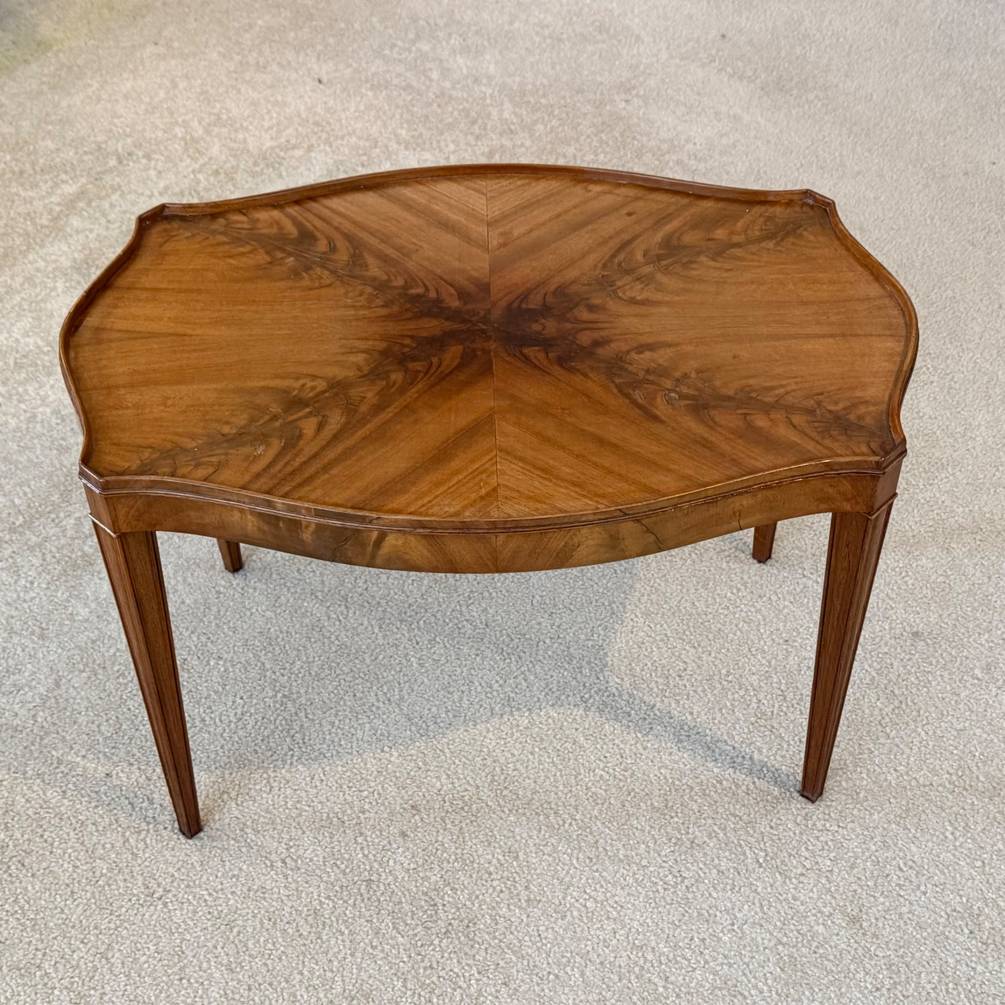 apron, bookmatched top in four quadrants, on tapered squared legs. Machine made, characteristics of mahogany, overall lighter tones. Vintage, ca. first half 20th c.