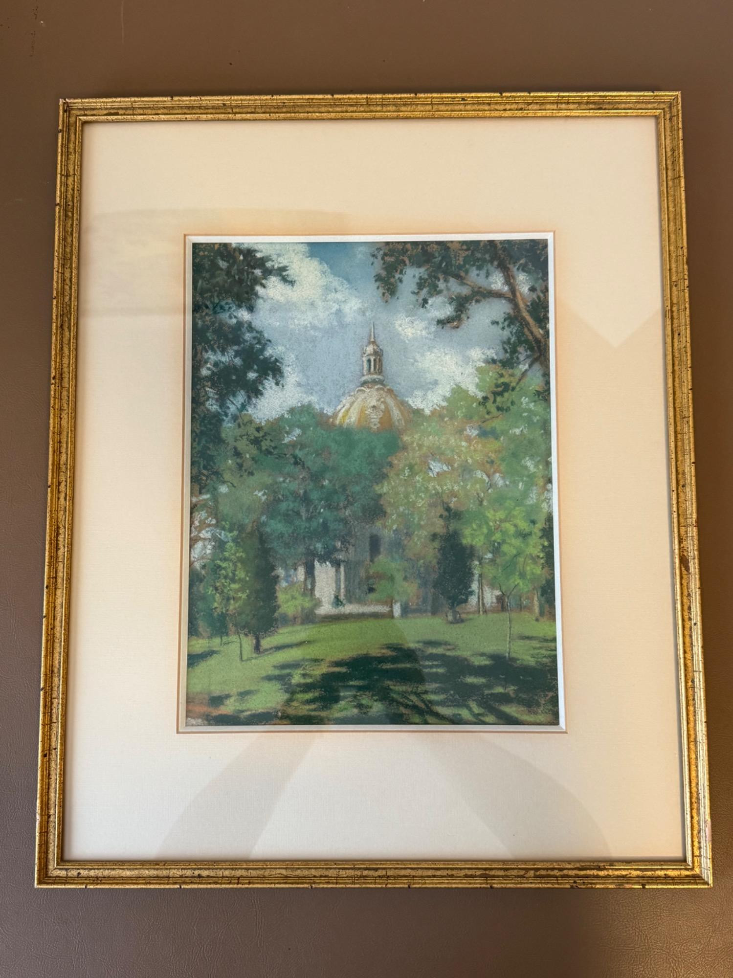 Drawing, pastel, white-domed building behind trees. No visible signature, possibly a California artist, location/subject unknown, Impressionistic style, assumed 20th century. In a narrow gilded wood frame, matted.