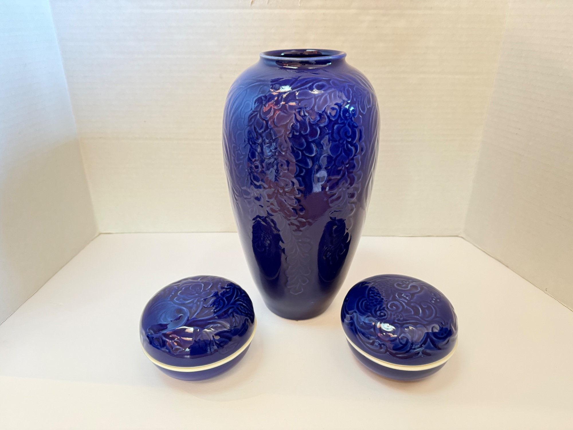 Arcanum Pottery Large Porcelain Vase and Jewelry Boxes. Vase is 12” tall. Jewelry boxes are 4.5” tall.