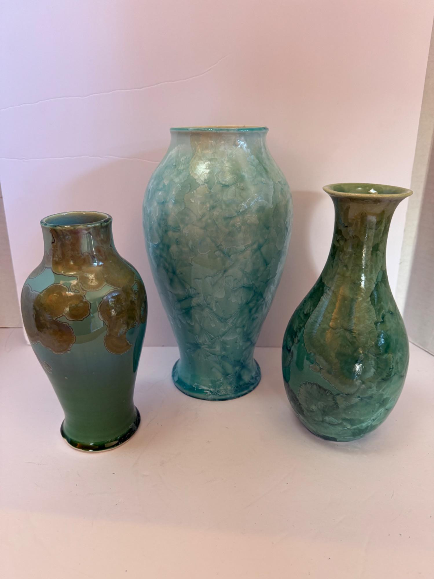 Arcanum Studio Green Porcelain Crystalline Vases. Measures 8.5”- 11.5” tall