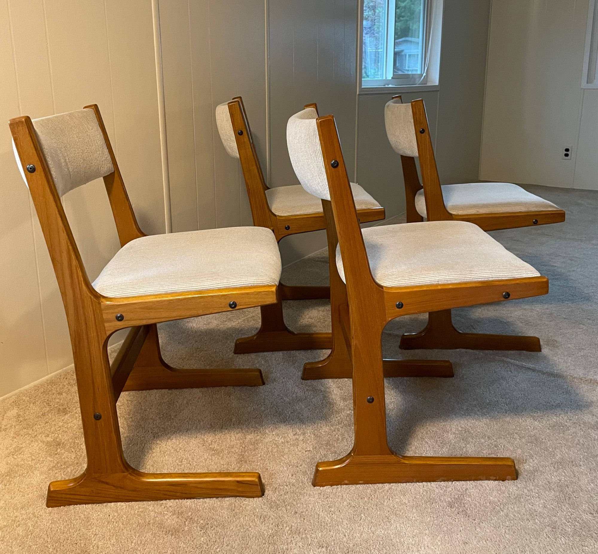 Four MCM Danish Teak Chairs-Gangso Mobler Style ONE CHAIR IS IN NEED OF REPAIR, IT IS SPLIT AT THE BASE, IT CAN BE REPAIRED. THIS PICK UP IS IN SEQUIM-PLEASE CONTACT KATHY TO ARRANGE A PICK UP TIME.KATHY- 206-552-5307 31" Tall x 19" W x 18" D