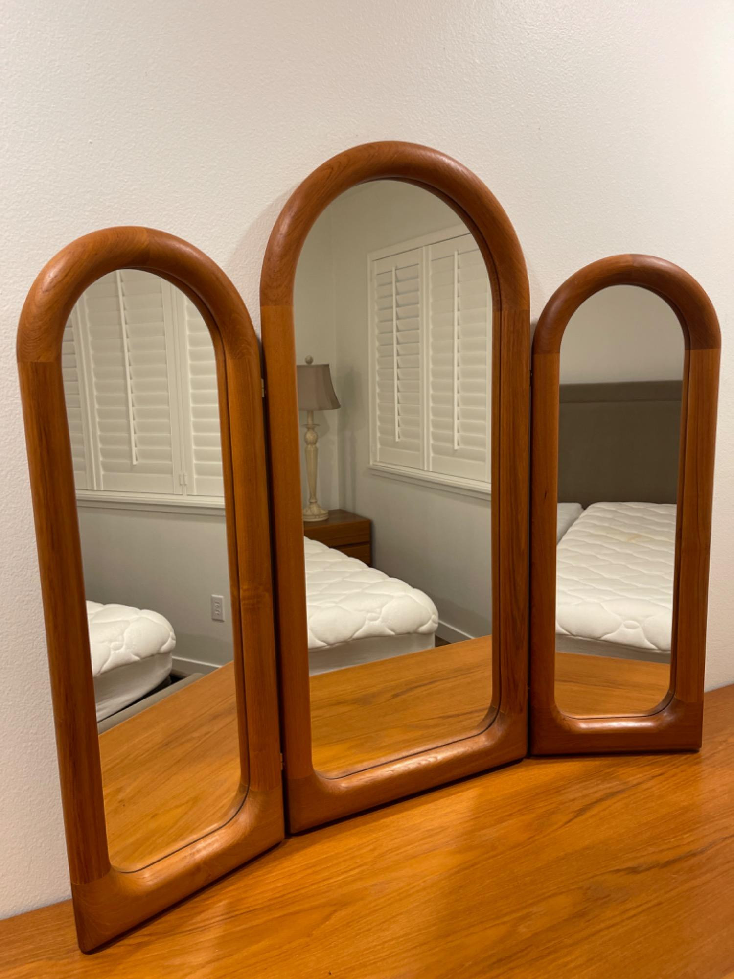 Vintage 1970s Danish Modern Teak Tri-Fold Mirror It is attached to the wall, so bidder will need to bring necessary items to safely remove. Great condition, minor scuffs and staining.