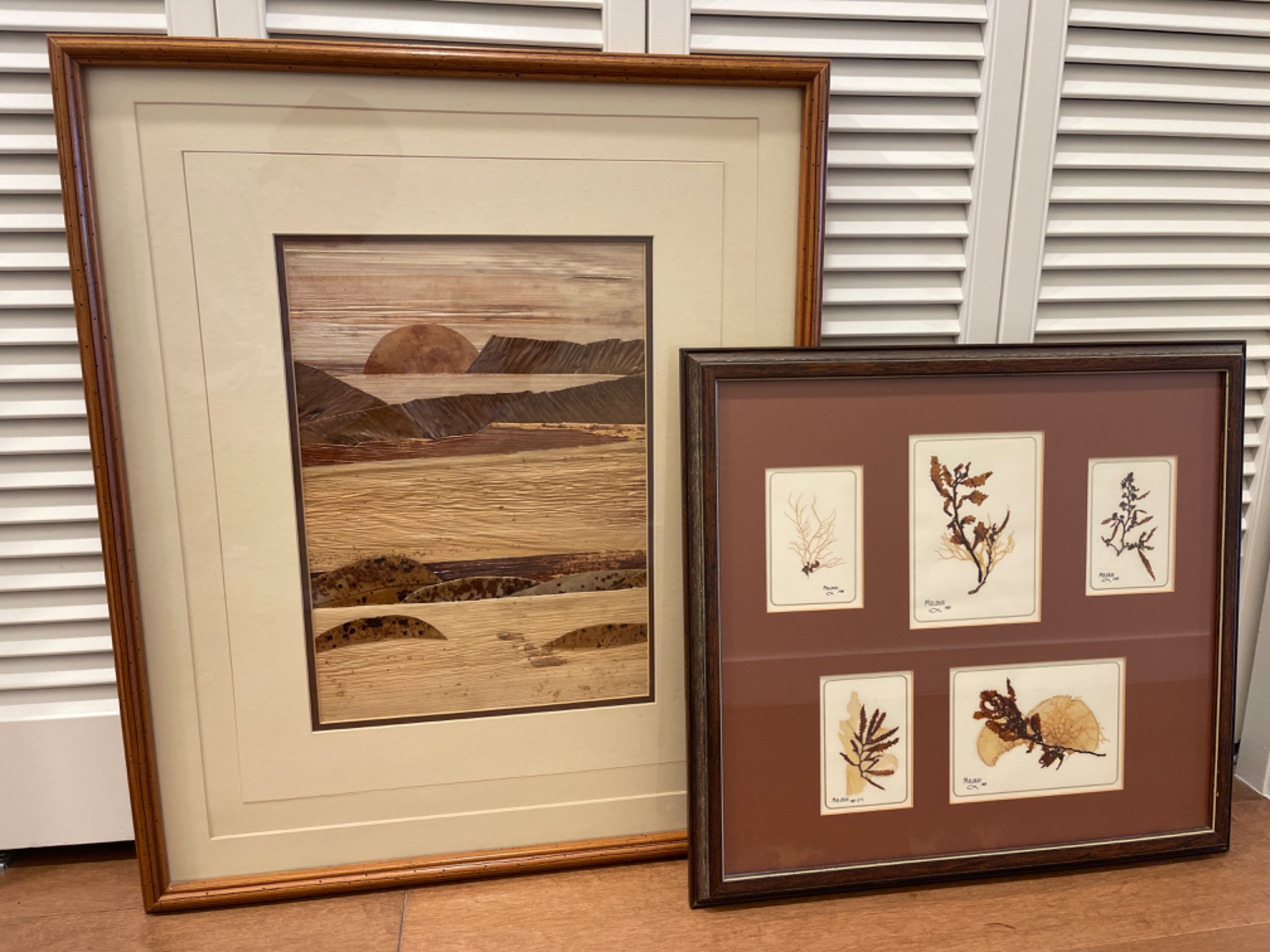 Molokai Prints Of Various Coral/Sea Plants Plus Sea Scape Made of Banana Bark Small: 18.5" W x 17" H Large: 21" W x 25" H Sea Scape piece has some significant staining. Please see photos. Smaller piece has some minor standing, but isn’t very noticeable.