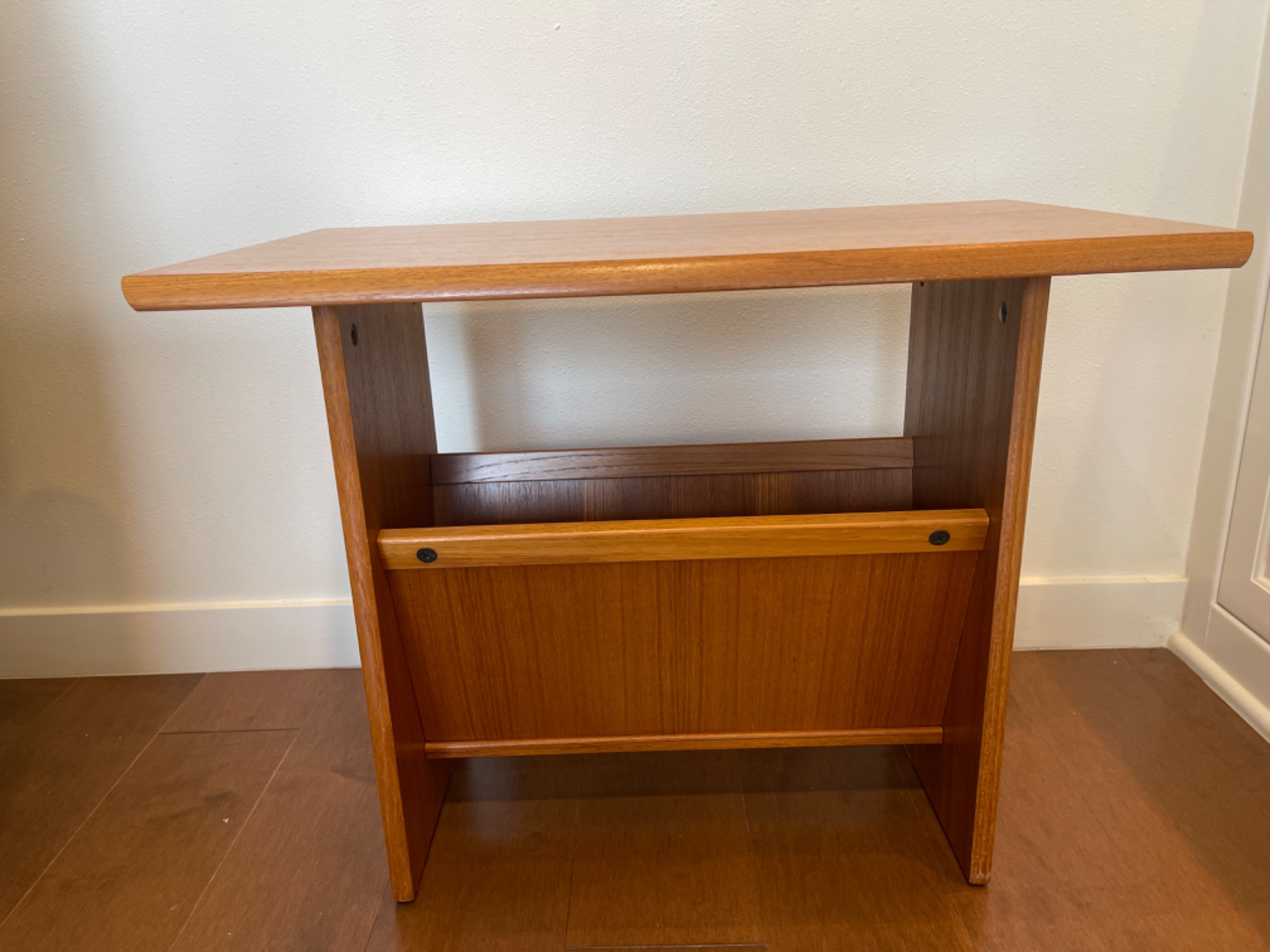 1970s Danish Mid Century Modern Magazine Rack Side Table Multiple scuffs and scratches. Please see photos.