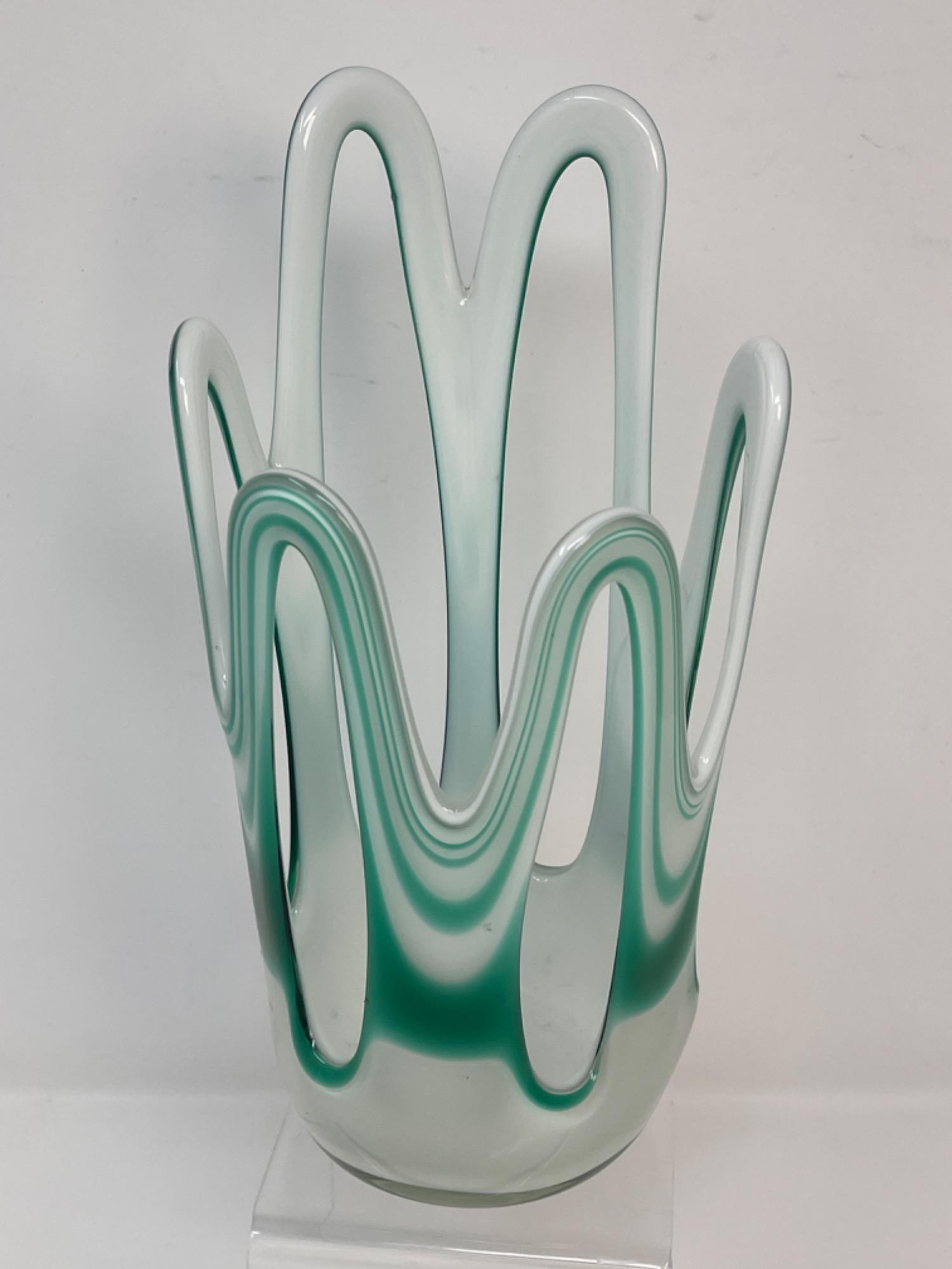 A Striped Looping Freeform Art Glass Pillar Candle Holder No signature found. Great condition. Bought in Oregon studio-hand blown
