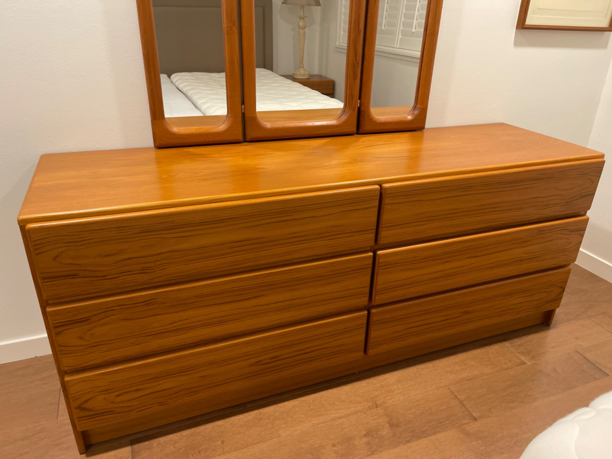 QUALITY Canada Designer Mid Century Modern Teak Veneered Dresser Mirror is not included. The mirror is on Lot # 19 Danish style. Some scuffs, scratches and stains. Please see photos. Good used condition.