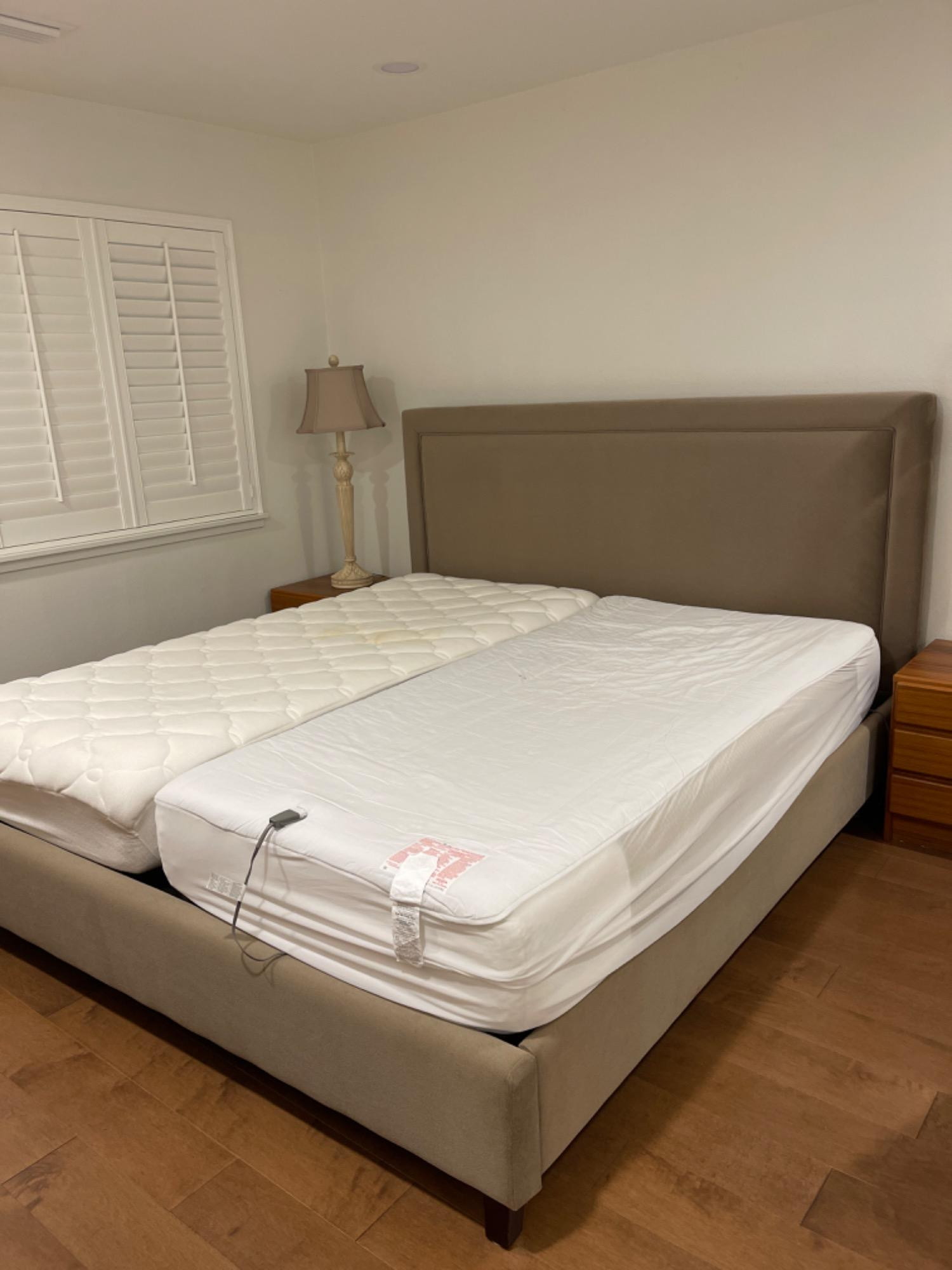 King Modern Cloth Frame/Headboard With Twin Mattresses Great used condition. Very minor scuffs and stains. Mattresses been protected with mattress covers, and those are included. One is heated, but untested. Headboard Measurements: 81" W x 50" H