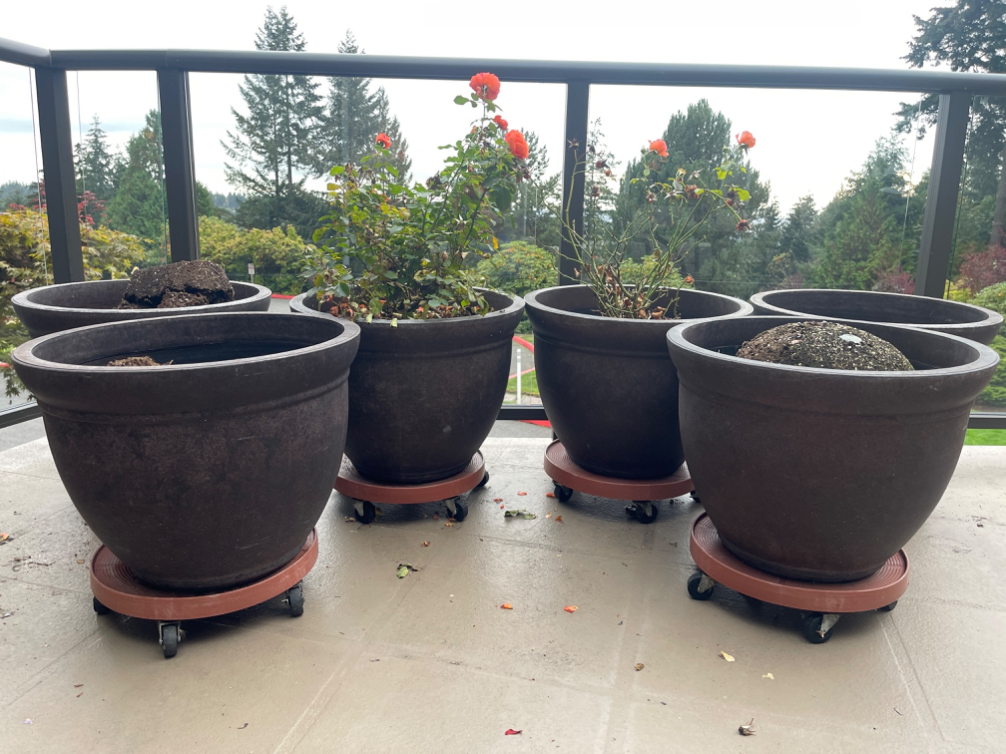 Six LARGE Resin Outdoor Pots On Roll Stands Rolling platforms are included 16” H without platforms and 22” W
