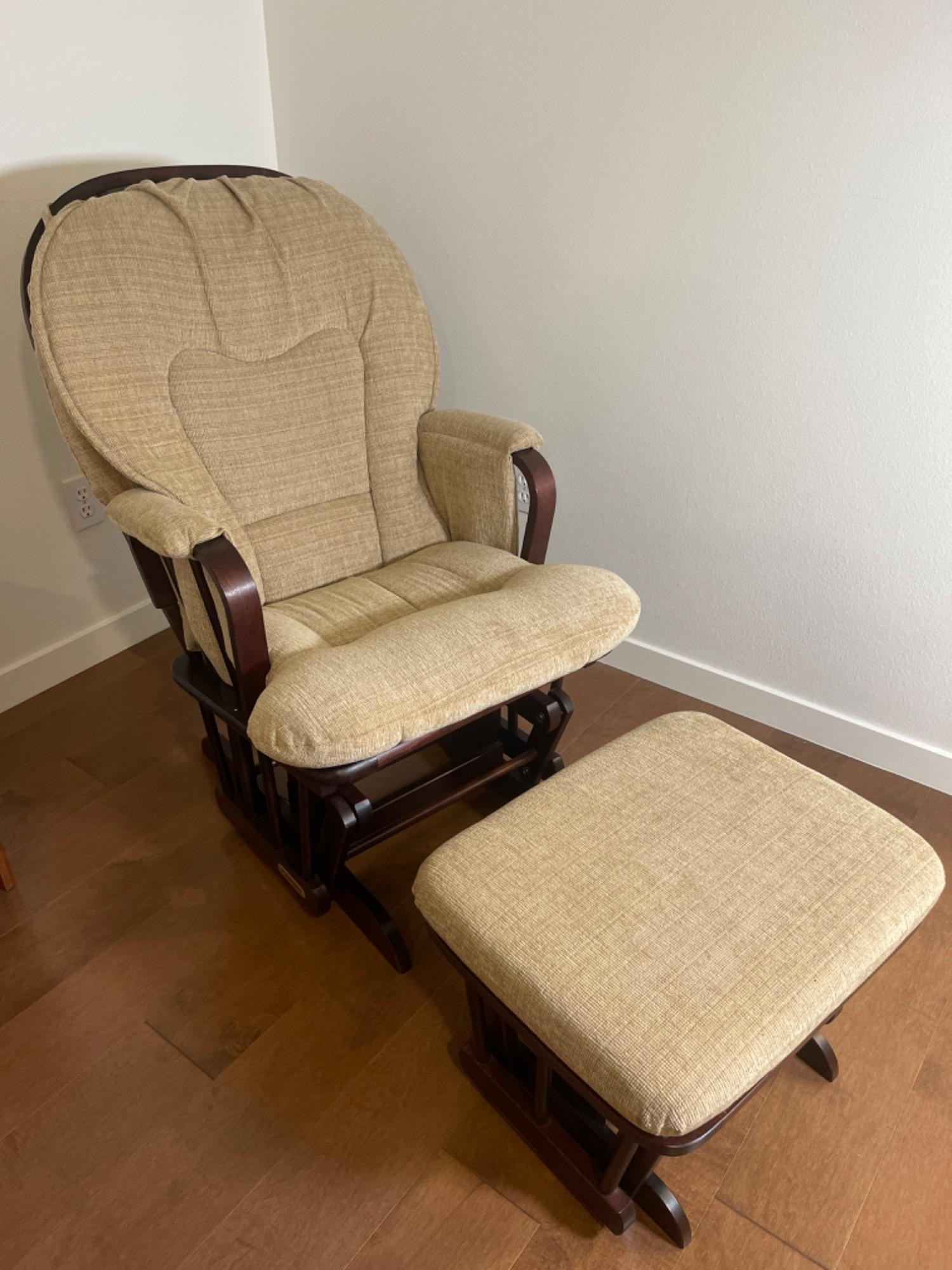 Shermag Glider Chair & Ottoman - Beige Fabric Great condition Chair: 25" L x 27" W x 39.5" H Ottoman: 22" L x 17.5" W x 15" H Shermag Furniture has been making quality baby furniture for over 91 years and that's why they are a leading manufacturer in the high-end nursery furniture market today. This family run business is known nationwide for their contemporary baby Shermag gliders and ottomans, giving parents what they need to create an ideal, soothing nursery for their baby. Shermag's stylish glider and ottoman sets usually start in the nursery and then easily transition into an adult space in later years.