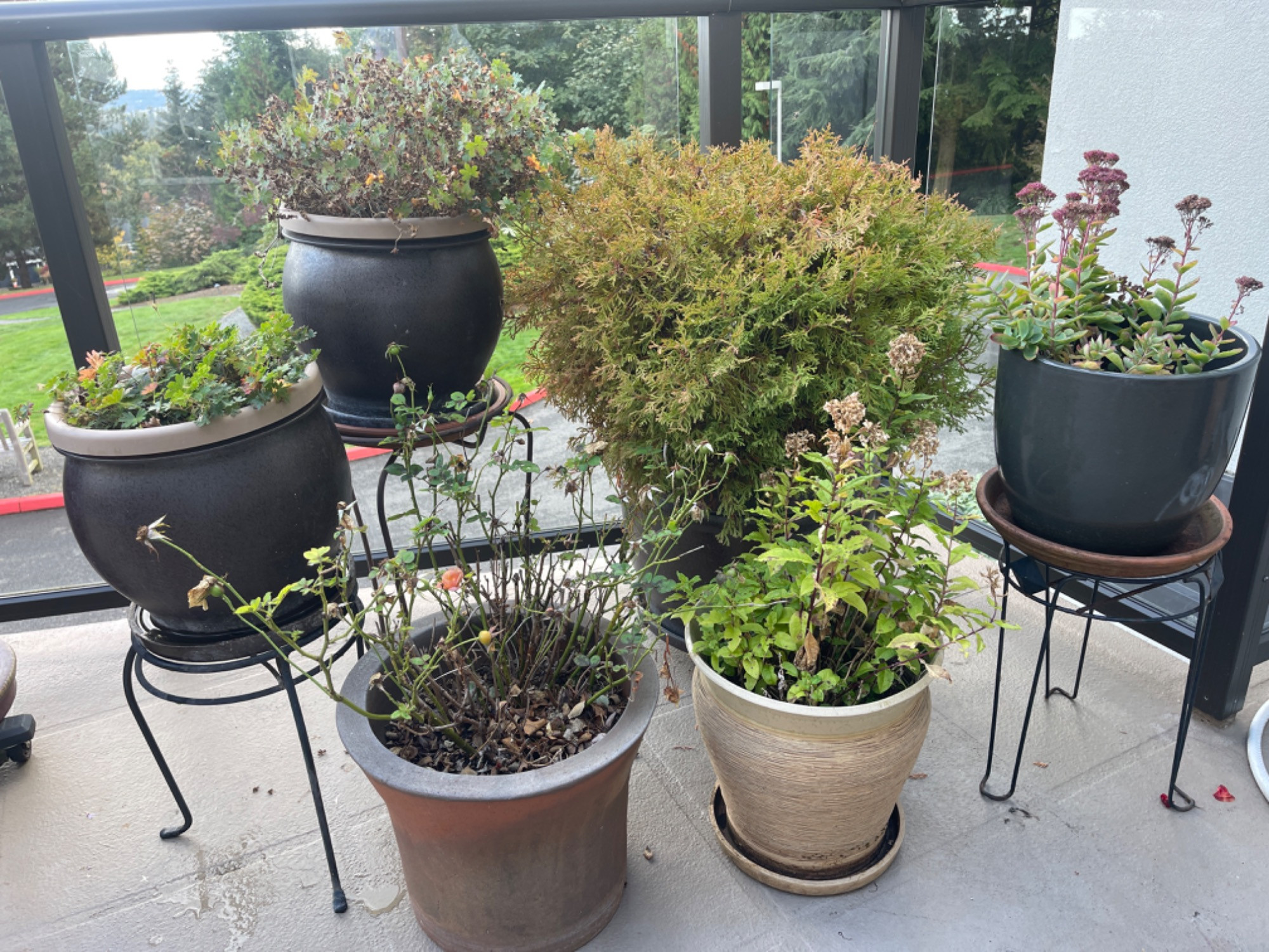 Assorted Outdoor Pots With Multi Level Stands - Plants Still In Bloom! Largest Pot: 15” H Smallest: 10” H All stands have rusting. All pots have some scratches and scuffs, but are in good condition.