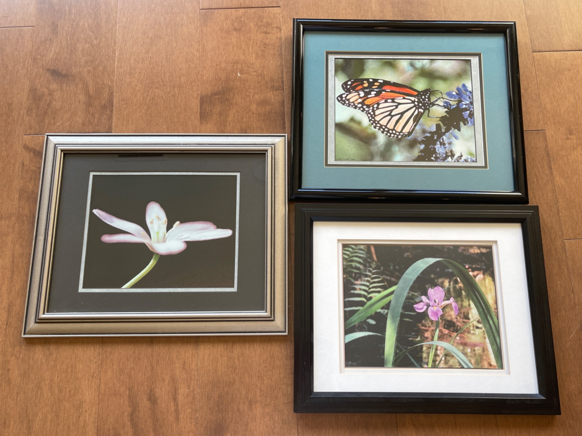Framed Photos Of Flowers And Butterfly Good used condition. Smallest: 16" W x 13" H Largest: 16.5" W x 13.5" H