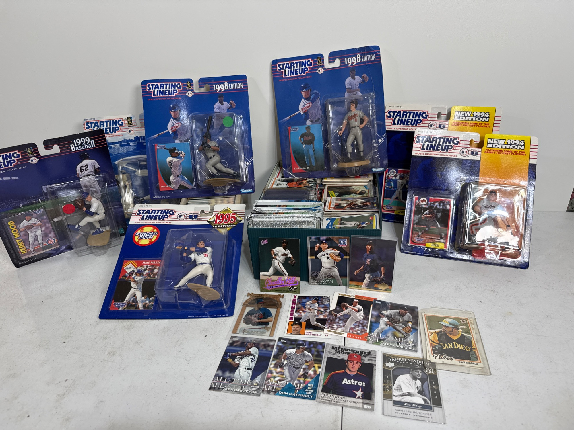 NIB. Starting Lineup baseball collectibles. Derek Jeter, Cal Ripken Junior, Bernie Williams, Mike Piazza. Box of baseball cards includes several unopened packs and several in sleeves and hard cases. Lou Gehrig, Don Mattingly, and Ken Griffey Junior, Dave Winfield, Nolan Ryan, Bo Jackson.
