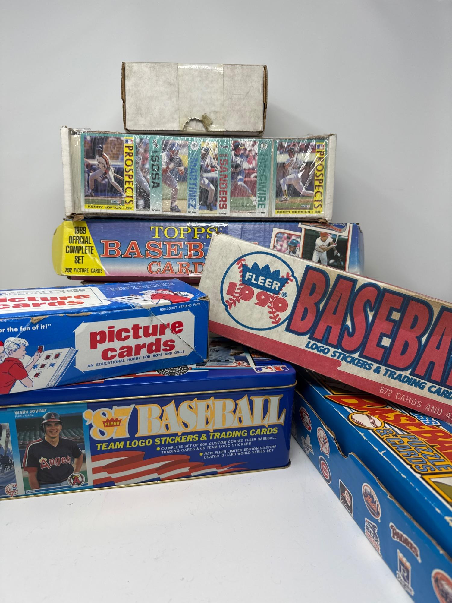 Nine boxes of baseball trading cards. Fleer, Topps, Score, Don Russ and more. Sets not verified. Fleer 1987 set. Don Russ, tops. 1987 through 1992. Ken Griffey Junior, Derek Jeter, Pete Rose, Cal Ripken Jr, Jackie Robinson, Whitey Herzog. Several with autographs. Several are in cases or protective sheets.