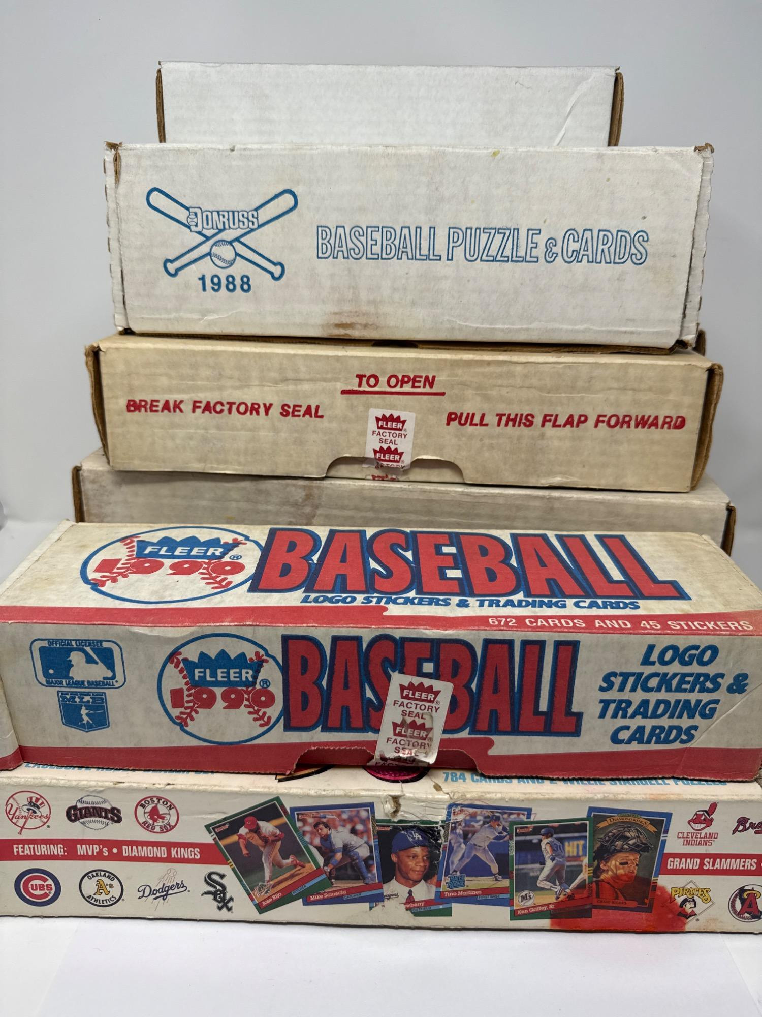 11 boxes of new baseball cards. Fleer 1990, Don Russ 1991, 1988. Collection years cover 1988 through 1991. Some boxes include puzzles, assorted extras. Boxes include Julio Franco, Ozzy Smith, Dennis Eckersley, Ryne Sandberg, Gary Sheffield, Kirby Puckett, George Brett, Alvin Davis, Sterling Hitchcock, and more. Sets cannot be verified.
