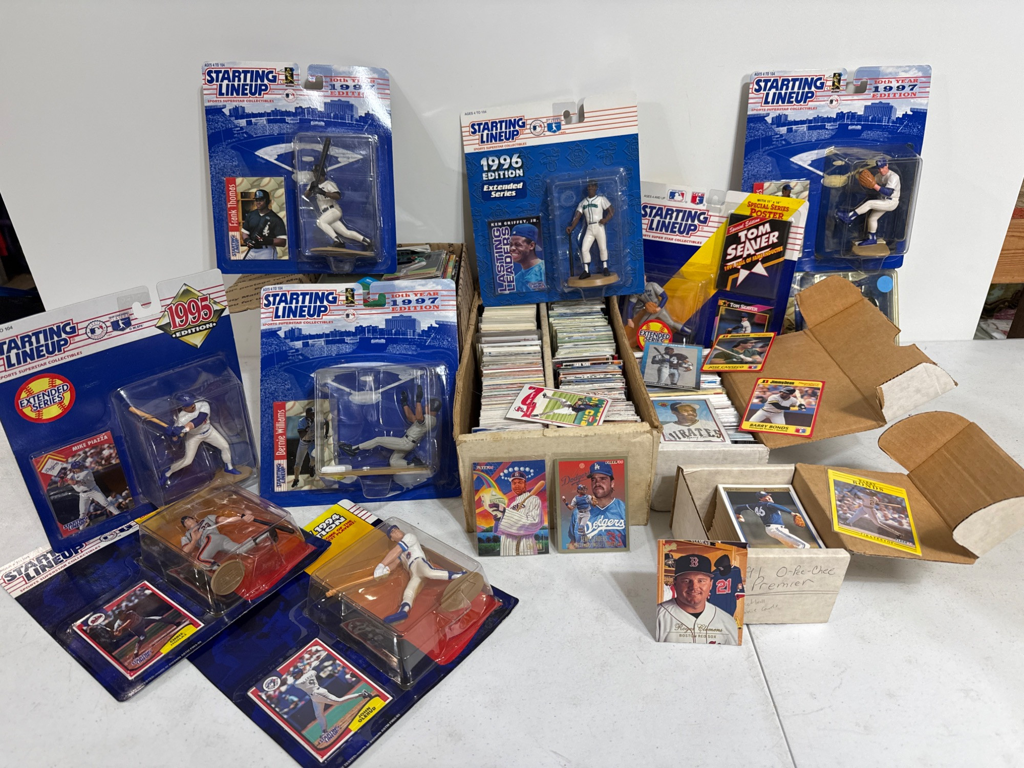 NIB. Starting Lineup collectible figures with collector cards. Multiple boxes of collector trading cards. Sets not confirmed complete. Mix of other sports included Barry Bonds, Bo Jackson, Jose Canseco, Roger Clemens, Tony Gwynn, Roberto Clemente and more.