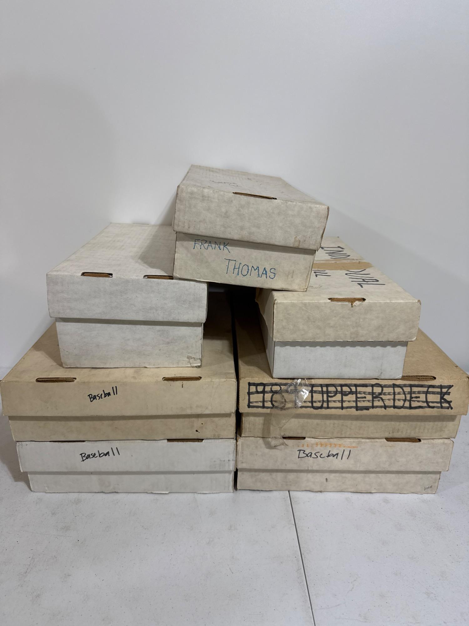 Start a collection for your favorite rookie player with a large lot of trading cards. Seven boxes of vintage baseball cards. Cannot verify completeness. Julio Franco, Dan Pascual, Ron Kittle, Scott Fletcher, Phil Nevin, Roberto Alamar, Ken Griffey Jr, Cal Ripken Jr, Mike Schmidt, David Justice. Variety of brands. Topps, Fleet, Donn Russ, E Motion.