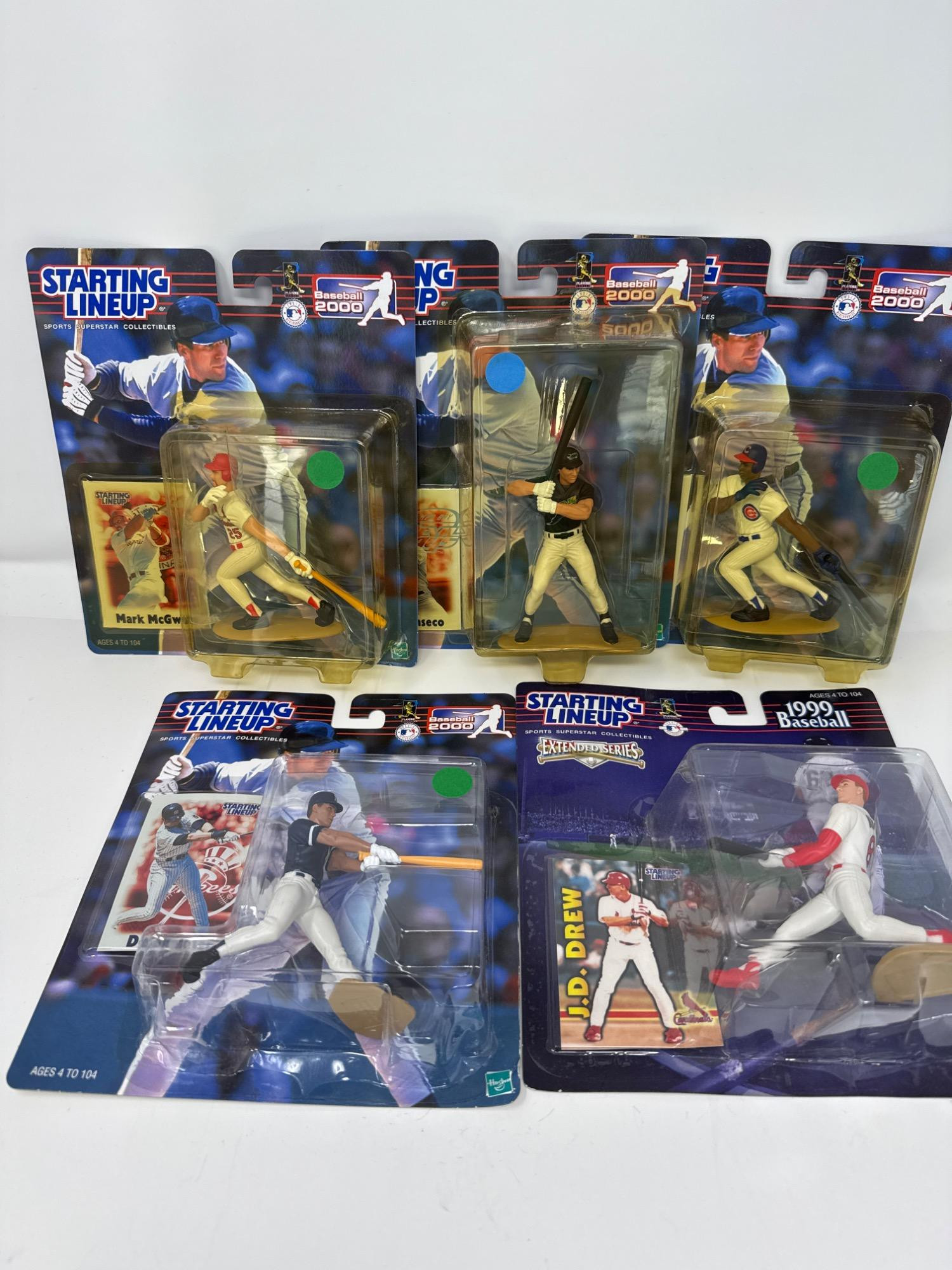 NIB. Starting Lineup superstar collectibles. Extended series. 1999 J.D Drew. 2000, Jose Canseco, Derek Jeter, Sammy Sosa, Mark McGuire. Includes collector card. Battle for the HR record between Sosa and McGuire.