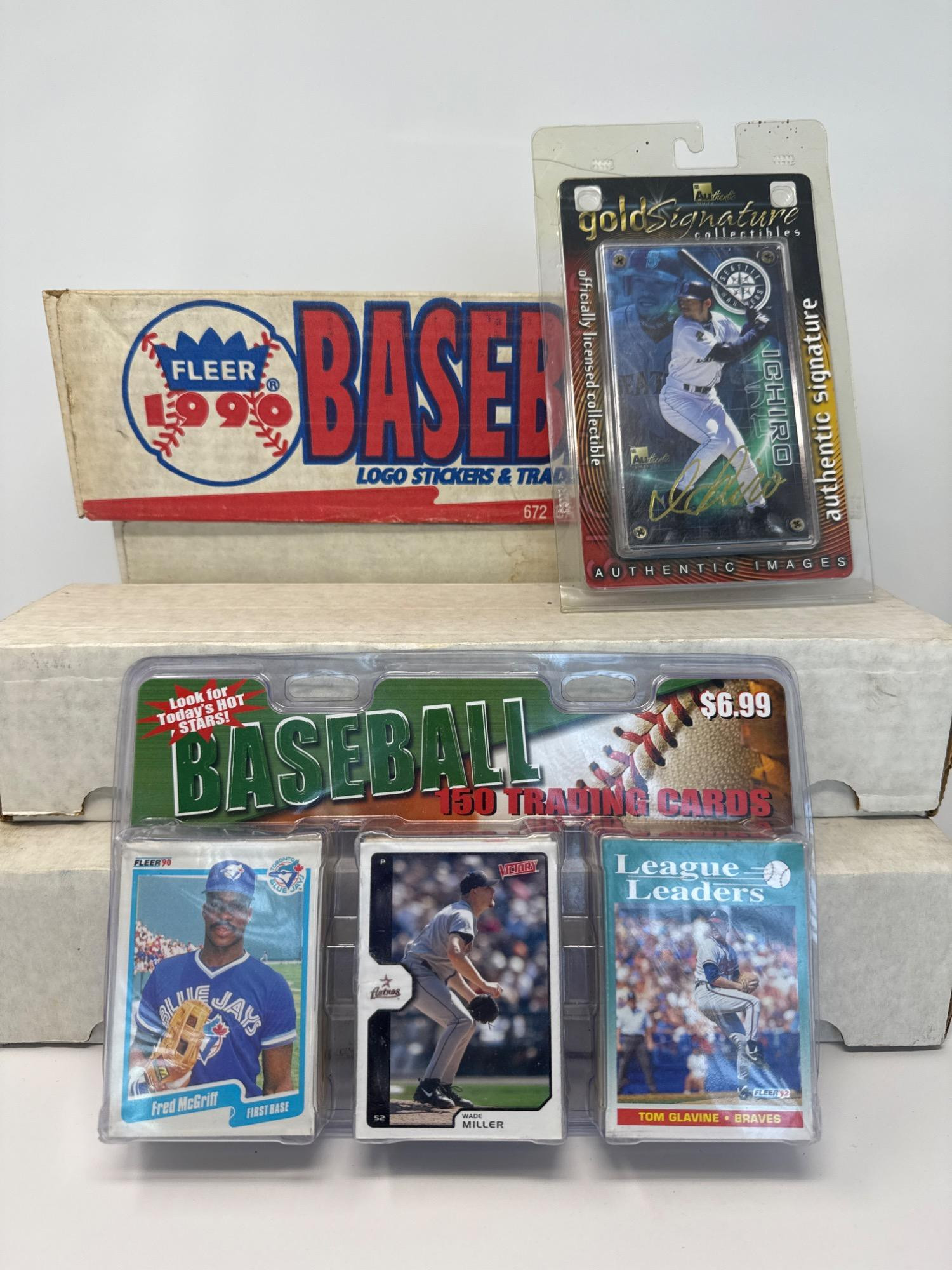 Large collection of Baseball card sets. Encased Ichiro card with autograph. Several are still in original packaging. Multiple brands represented. Several eras of baseball cards. Hundreds of cards. Ernie Whitt, Jeff Kunkel, Ricky Hornton, Danny Cox, Kevin Gross, Orel Hersheiser.