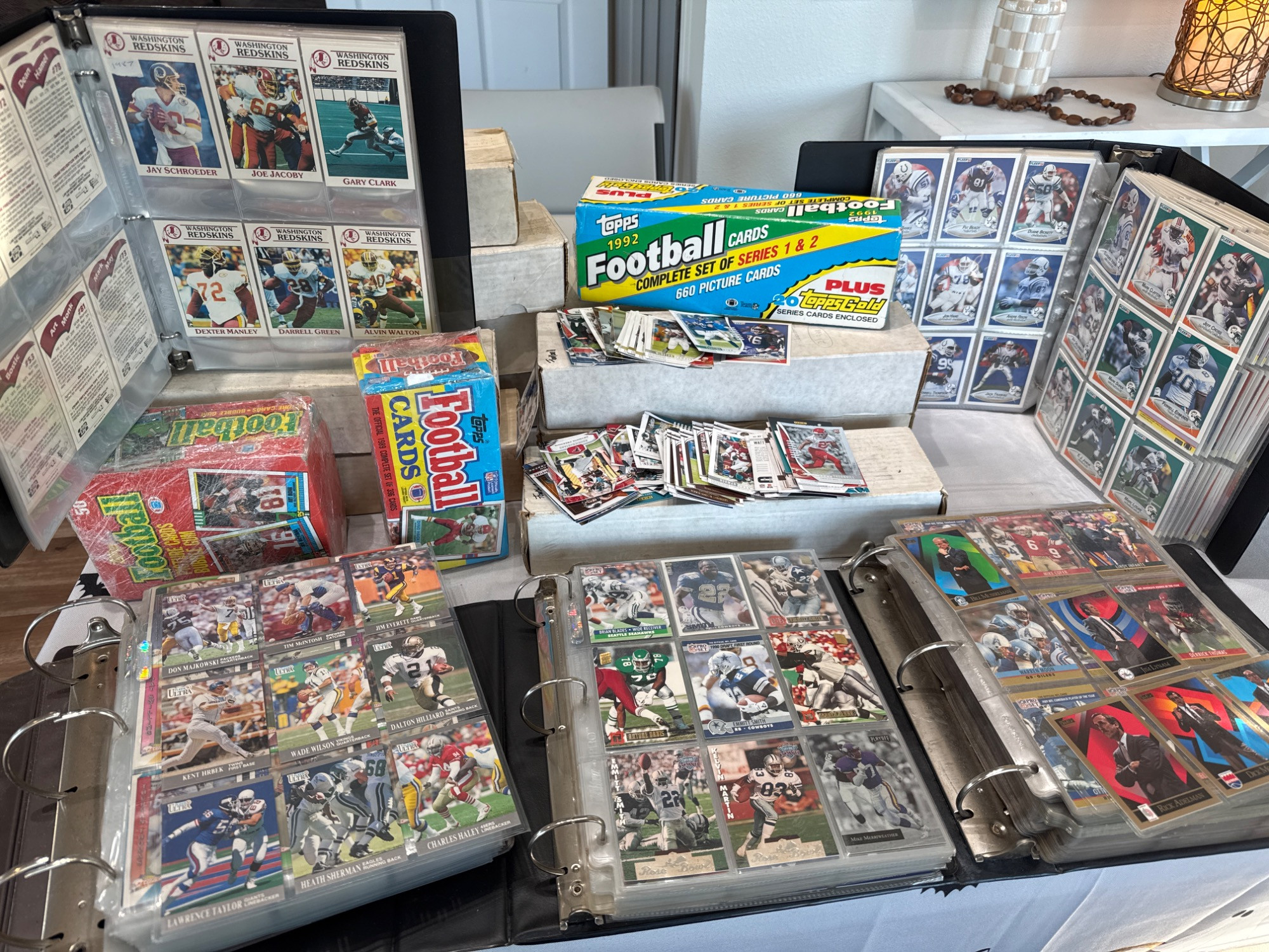 Hundreds of trading cards of your football favorites. Many sets are in sleeves. Andre Rison, Lawrence Taylor, John Elliot, Tyrone Corbin, Alvin Walton, Dexter Manley and more. Several basketball card sets also. A few baseball cards included. Unopened packs. Multiple eras and brands. Sets not verified complete.