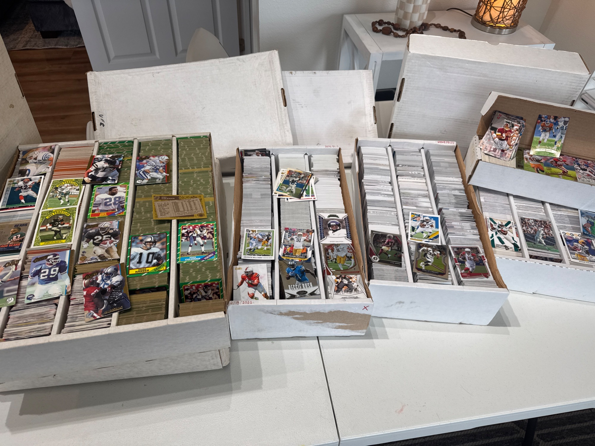 Six boxes. Peyton Manning, Marcus Allen, Boomer Esiason, Kenny, Easley, Lester Hayes, Steve Largent, Junior Seau, TJ Houshmandzedah, Kurt Warner and many more. Topps, Leaf, Action Pack, Team NFL, Skybox, Score and other brands. Most appear to be new and unused. Sets not verified complete.