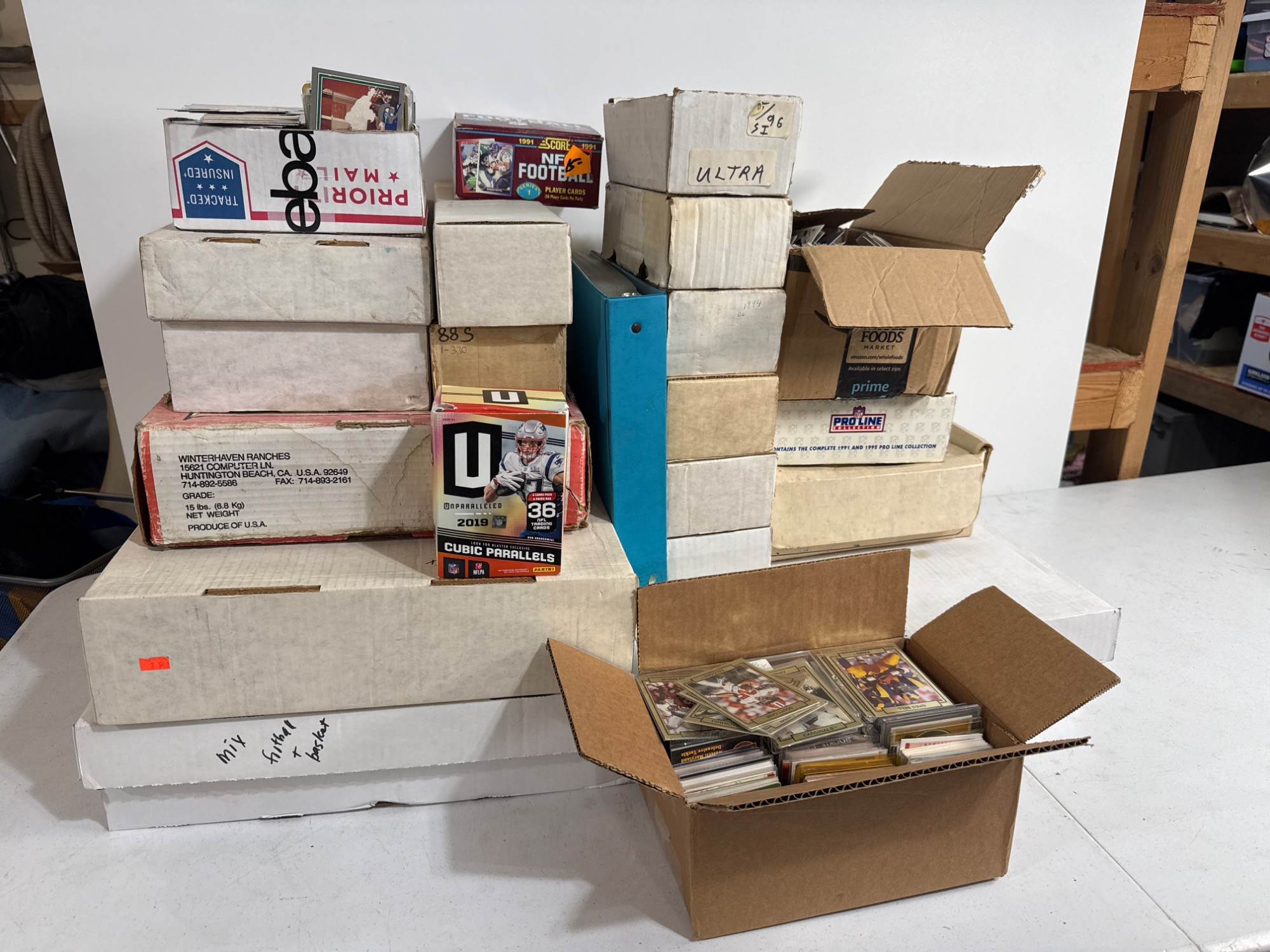 Enormous lot of football trading cards. Hundreds are new in box. Brian Bosworth, Ken Harvey, Michael Irvin, signed David Dunn. Steve Largent, Troy Aikman, Andre Rison, Boomer Esiason, Travis Kelce, Vonn Miller, Jim Arnold, Joe Flacco, Ted Ginn Jr, Kurt Warner, Tom Brady, Russell Wilson, Terrell Davis, Patrick Mahomes, Eli and Peyton Manning, Bo Jackson, Shaquille Griffin, Golden Tate, Dak Prescott, Ezekiel Elliott, Monte Stickles, Terrell Owens, Thurman Thomas and more. A few baseball, hockey, basketball cards mixed in. Large number of cards are in sleeves. One set has autographs. Cannot confirm authenticity. Huge collection of Trevor Lawrence novelty trading cards in hard cases.