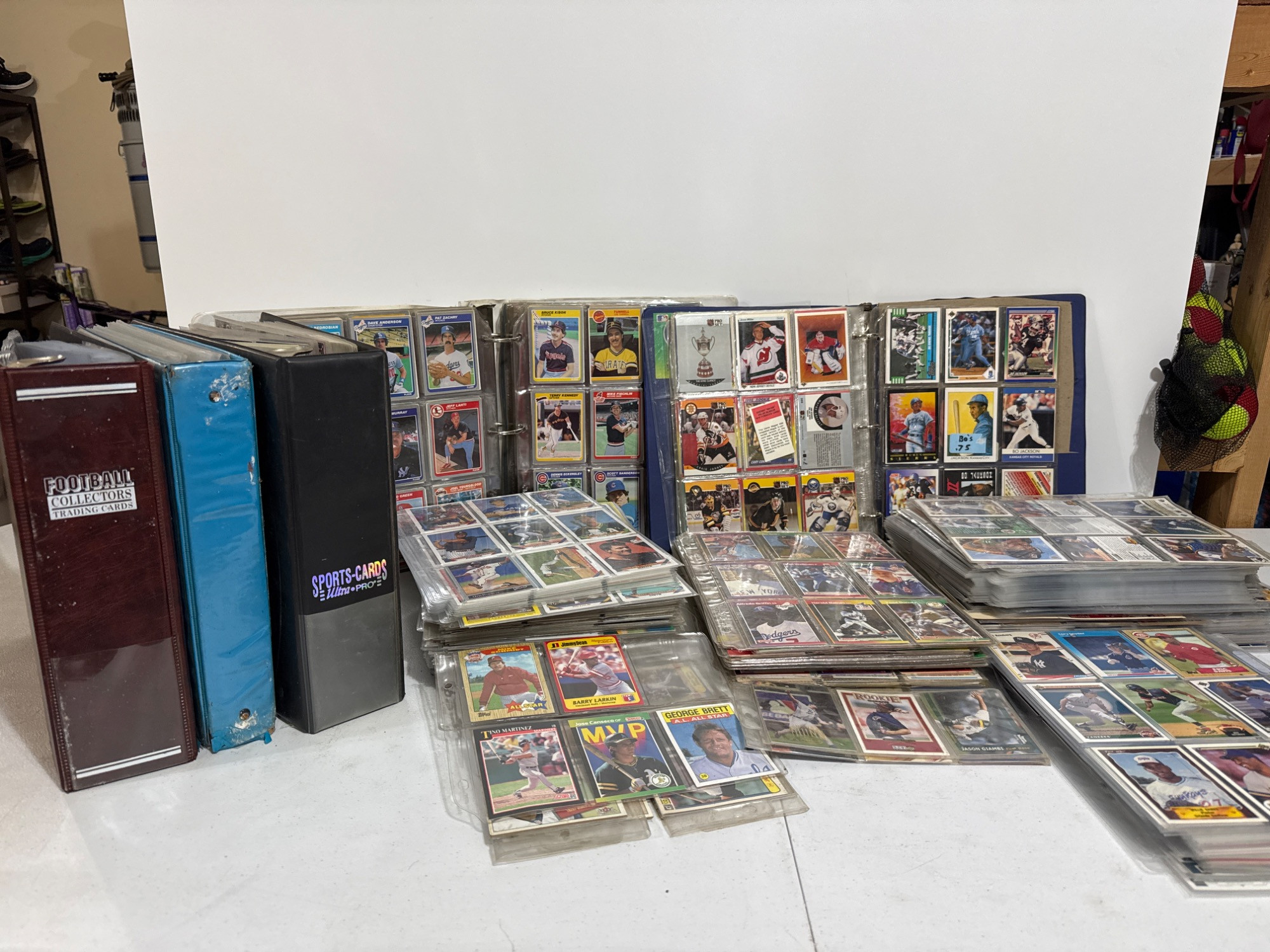 Five binders, large stacks of loose sheets. Hockey, baseball, football, basketball and more. Bo Jackson, Phil Simms, Carlos Rodriguez, Tino Martinez, Jason Miller, Darren Puppa, Trevor Linden, Brock Huard, Trent Green, Pepper Johnson, Reggie Cobb, Travis Kelce, Cooper Kupp, Moses Malone, Magic Johnson and more. Vintage cards from the negro league of baseball, early era baseball series. Lou Gehrig and Babe Ruth. Stickers, sleeves, collector cards.