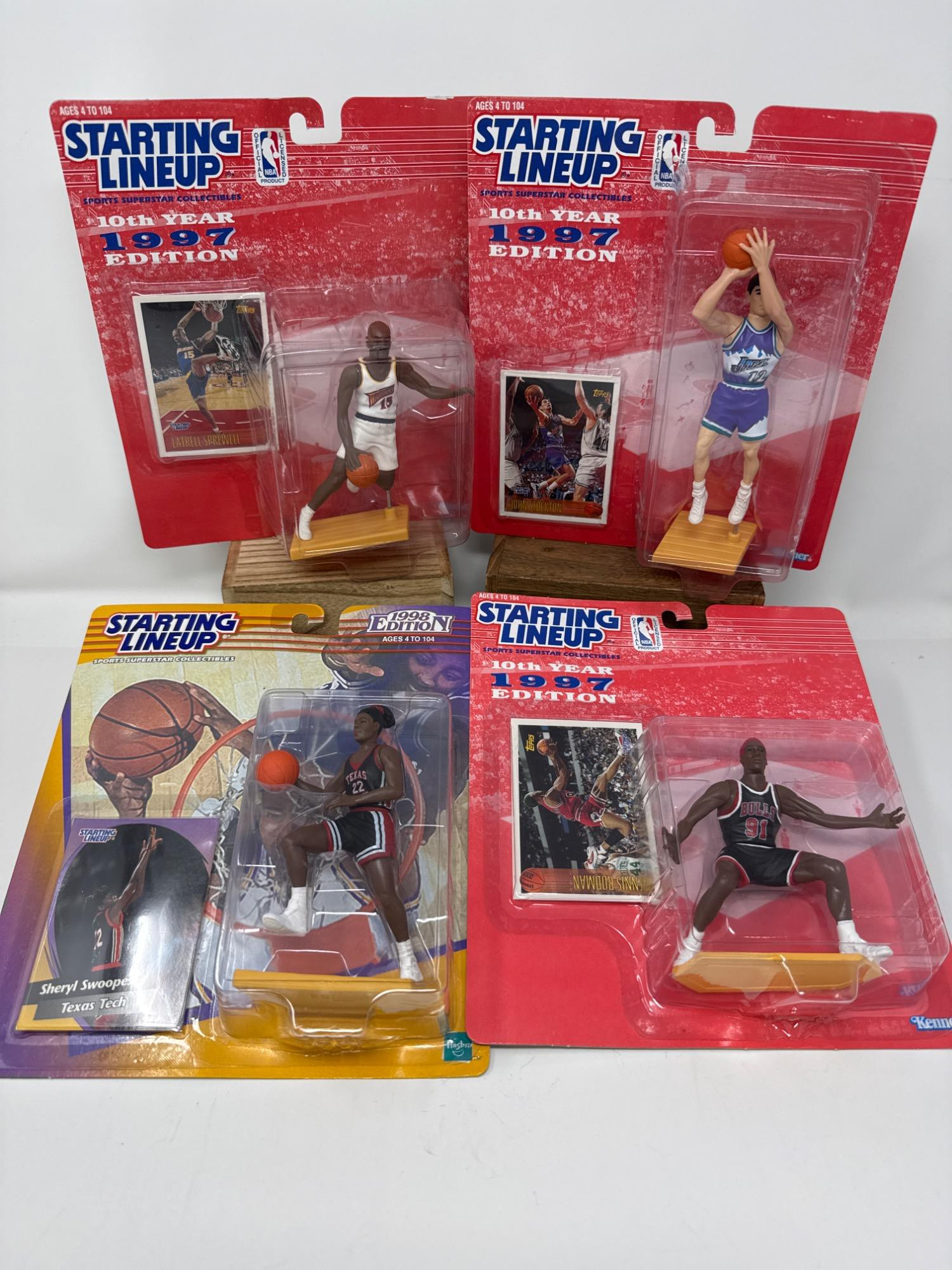 NIB. Set a four starting lineup basketball collector figures. 1997 edition with Latrell Sprewell, John Stockton, Dennis Rodman. 1998 edition Cheryl swoops Texas Tech University. Includes collector cards.