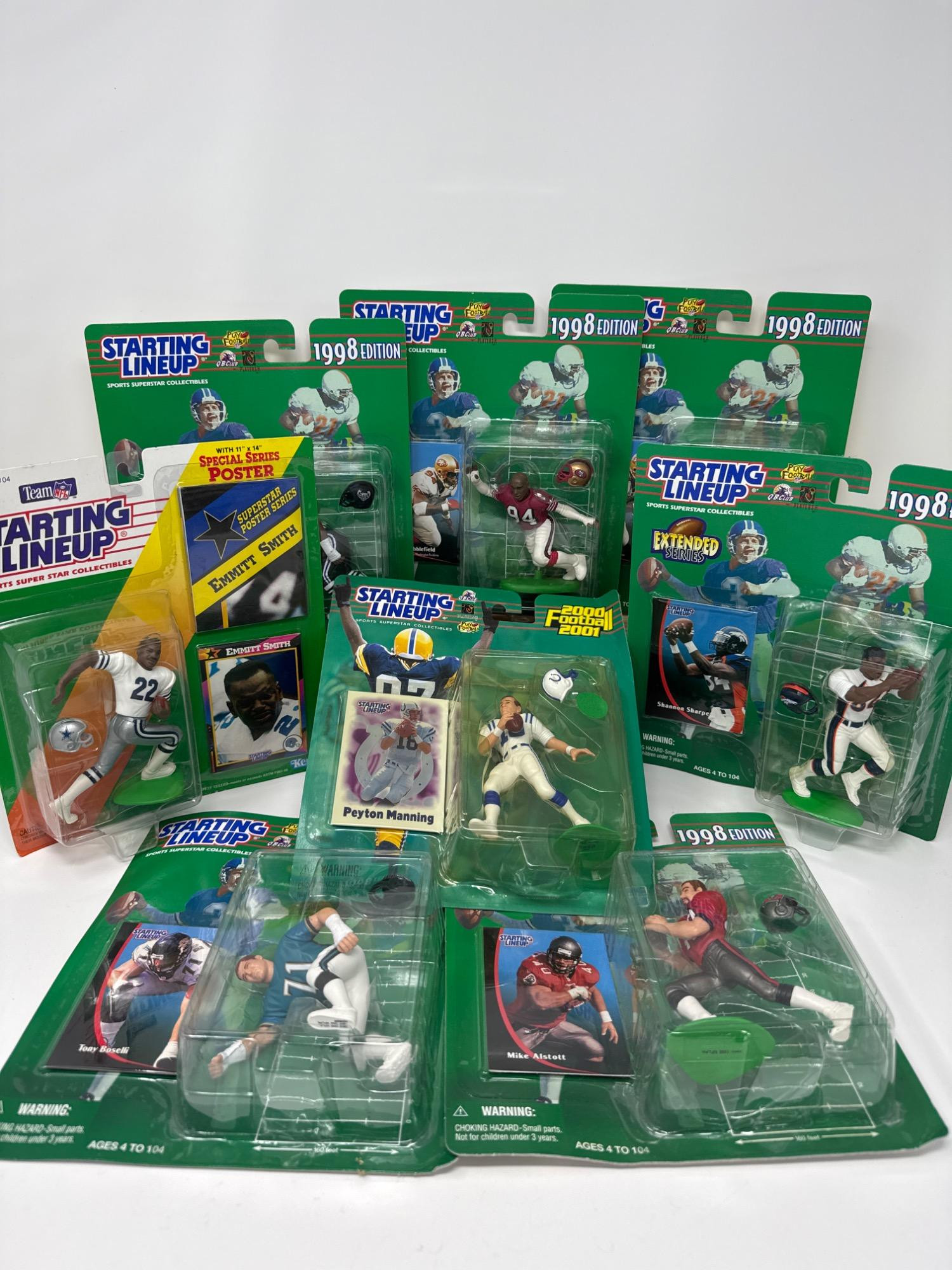 NIB. Starting lineup football edition. 1998 and 2000 players. Tony Boselli, Mike Alston, Shannon Sharpe, Dana Stubblefield, Jonathan Ogden, Emmett Smith and Peyton Manning. Includes collector cards.