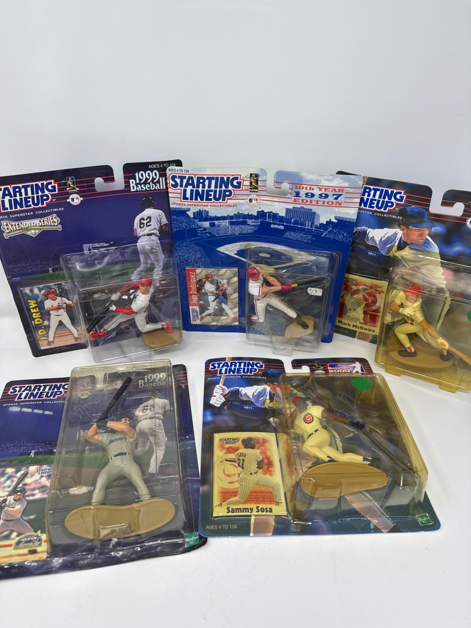 NIB. Starting lineup baseball edition. 1999 through 2000 players. Mark Maguire, Ivan Rodriguez, J.D Drew, Jeff Bagwell and Sammy Sosa. Includes collector cards. In great condition.