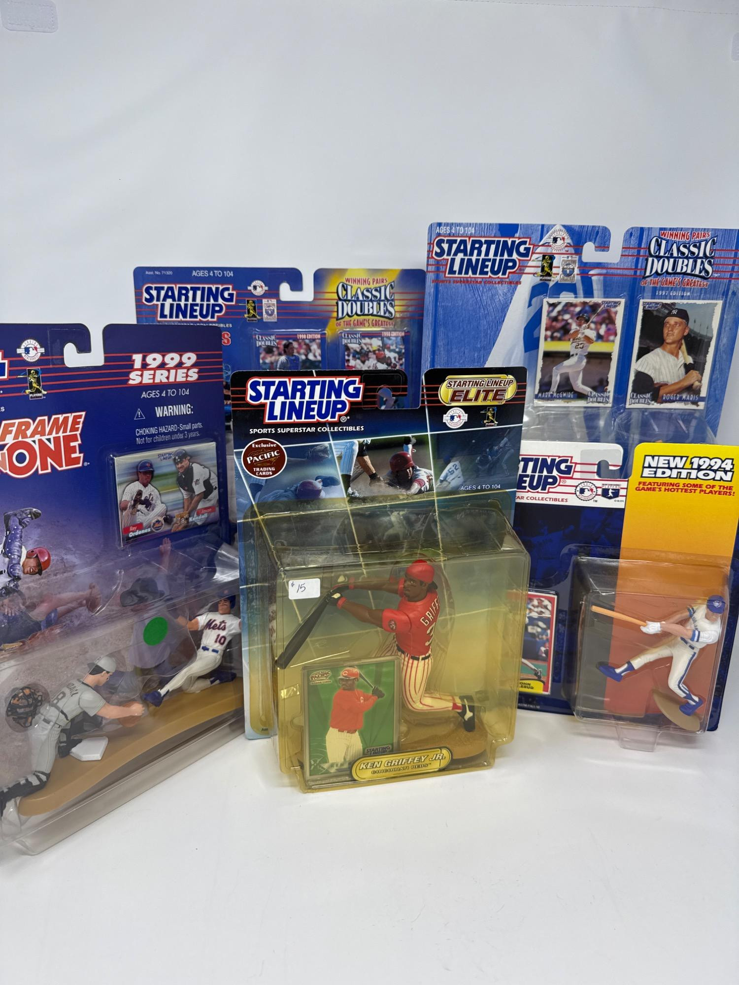 NIB. Starting lineup collectibles. 1994 John Olerud with collector card. Classic doubles sets. Mark McGuire and Roger Marris. Mike Piazza and Ivan Rodriguez. Freeze frame with Rey Ordonez and Jason Kendall. Ken Griffey Jr action figure with training card.