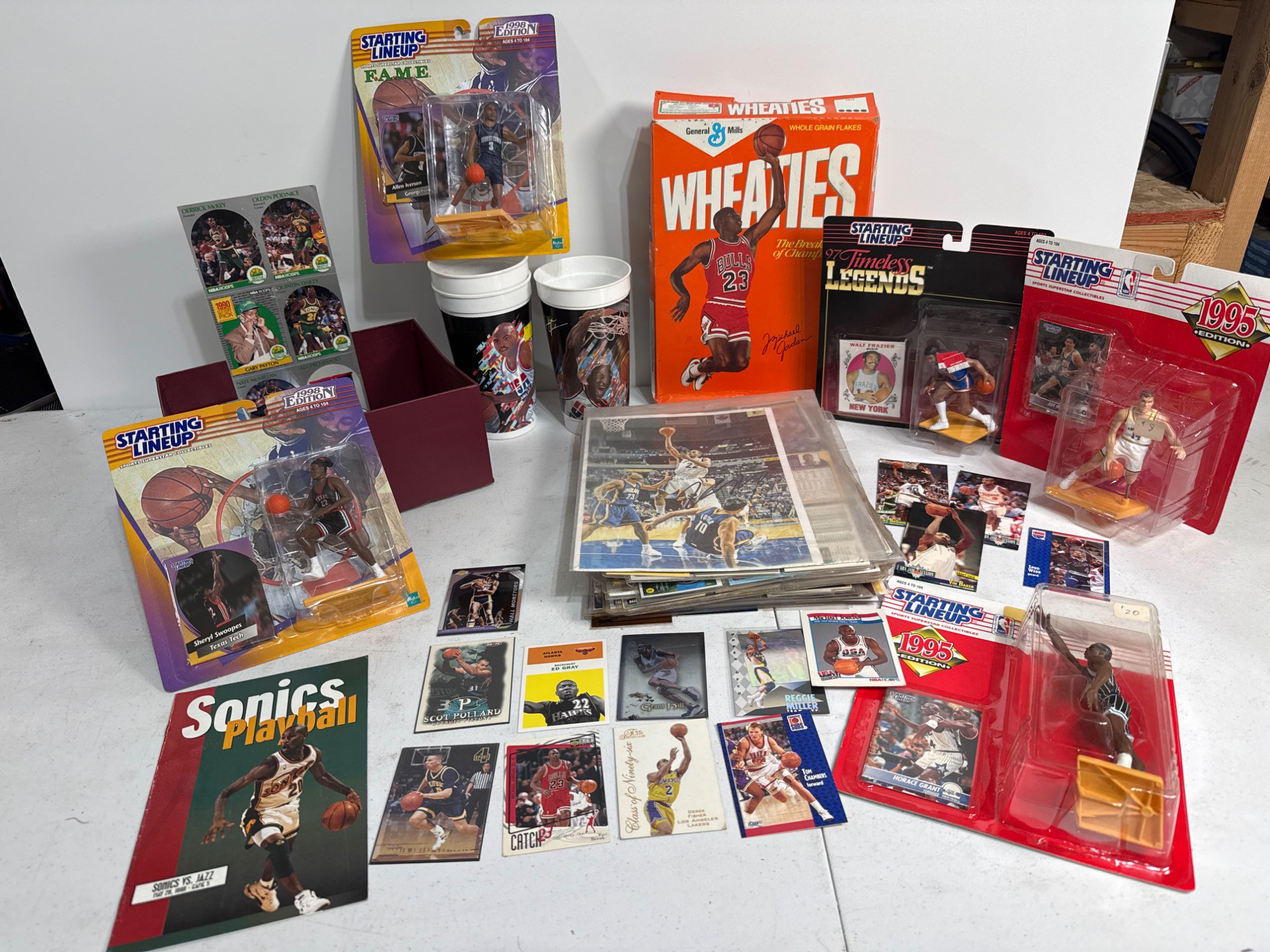 Autographed photo of Desmond Bane, possibly. Starting lineup collector figures. Includes collector cards. Horace Grant, Jeff Hornacek, Walt Frazier, Allen Iverson, Cheryl swoops. Michael Jordan Wheaties box, Charles Barkley, and Michael Jordan beverage cups. Sonics game program circa 1996. Assorted trading cards. Grant Hill, Scott Pollard, Jason Kidd, Michael Jordan, Tom Chambers, Reggie Miller, Kareem Abdul-Jabbar Condition varies on items from NIB to fair.