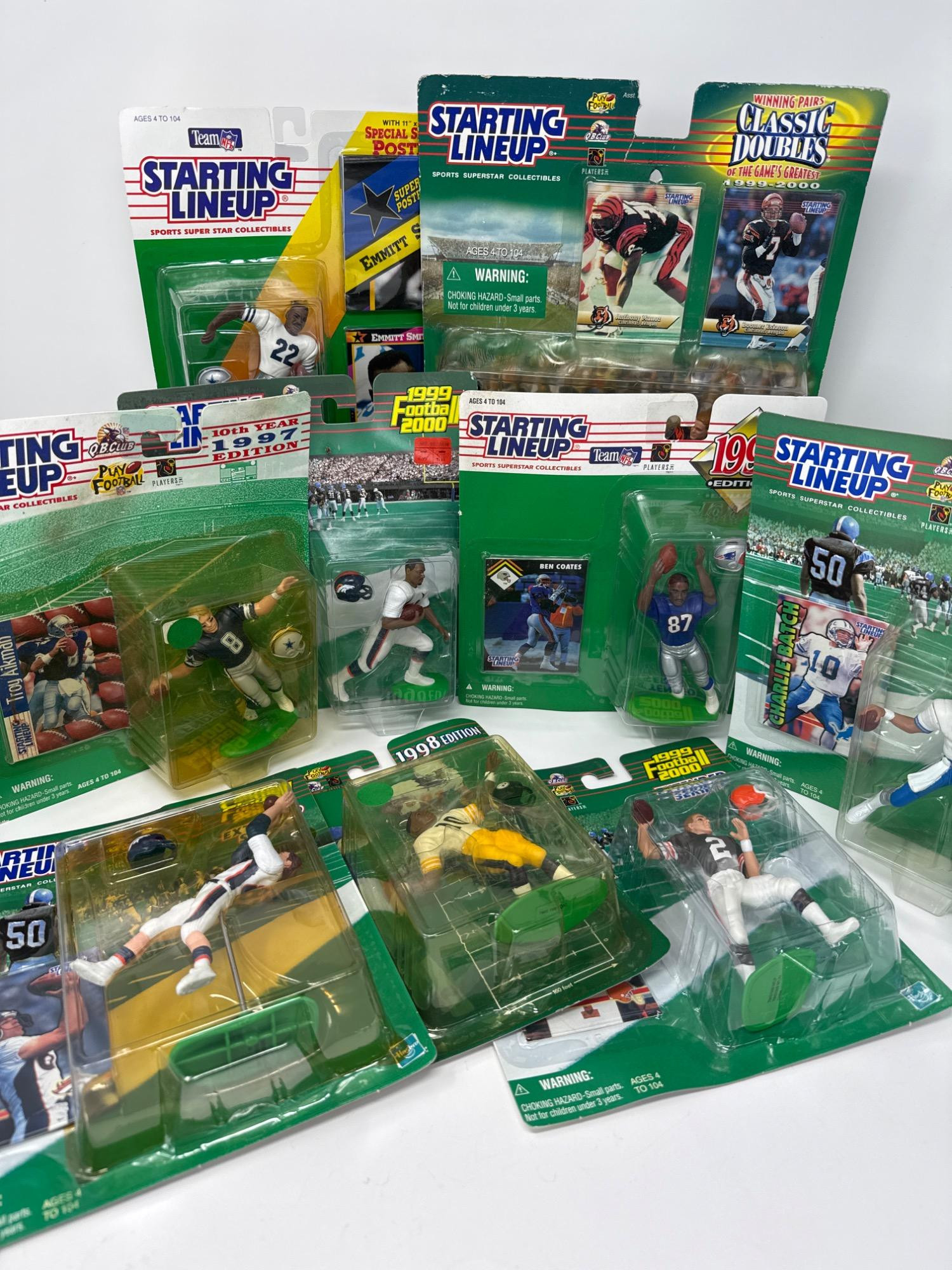 NIB. Starting lineup football edition. 1995, 1999, 1997, 1998, 2000 football eras. One is a double set. All include training cards. Ed McCaffrey, Charlie Batch, Emmett Smith, Tim Couch, Kordell Stewart, Troy Aikman, Ben Coates, Terrell Davis, Anthony Munoz, and Boomer Esiason.