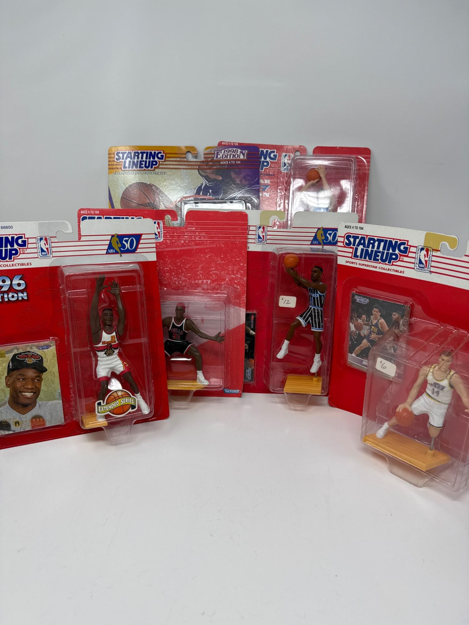 NIB. 1995 through 1998 basketball season players. Starting Lineup collectibles. John Stockton, Cheryl Swoops, Dennis Robinson, and Anfernee Hardaway, Jeff Hornacek, Mutambo. Includes collector cards.