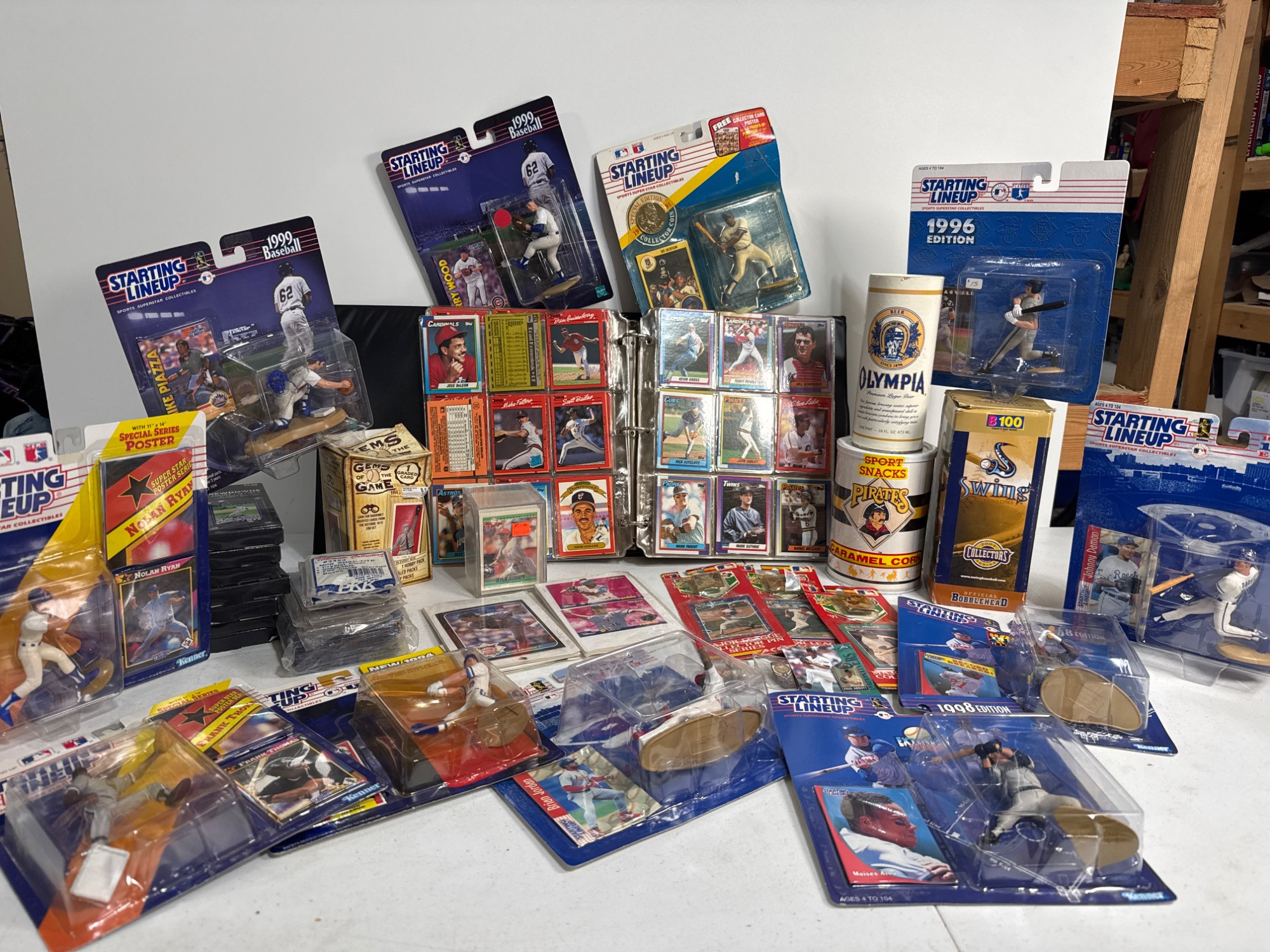 Vintage sports collectibles and trading cards. Unopened box of Pirates caramel corn. Olympia beer puzzle. NIB snap tight card cases and screw downs. NIB Starting Lineup action figures. Collector pin series. Beiderbecke bobble head. Trading cards with Dan Quisenberry, Bo Jackson, Bill Schroeder, Rick Sutcliffe, John Smiley, and more. Most are in sleeves.