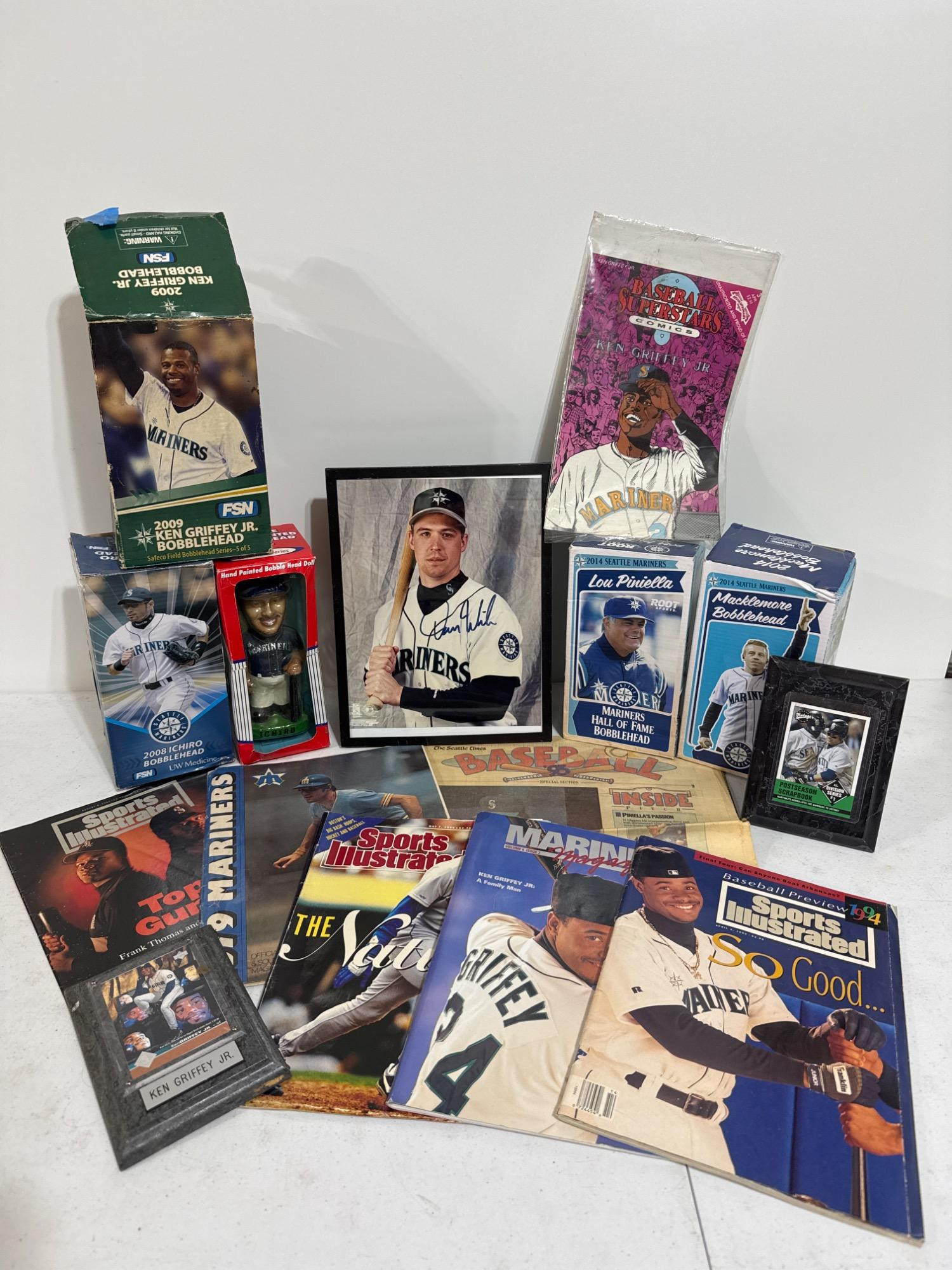 Sports Illustrated and Mariners media. King Griffey Junior and Mariners trading cards on plaques. Five bobble head dolls. Two Ichiro bobbleheads, Lou Piniella, Macklemore, Ken Griffey Junior. Griffey bobble head has a broken arm. Ken Griffey Junior comic book. Autographed and framed photo. Three more magazines added.